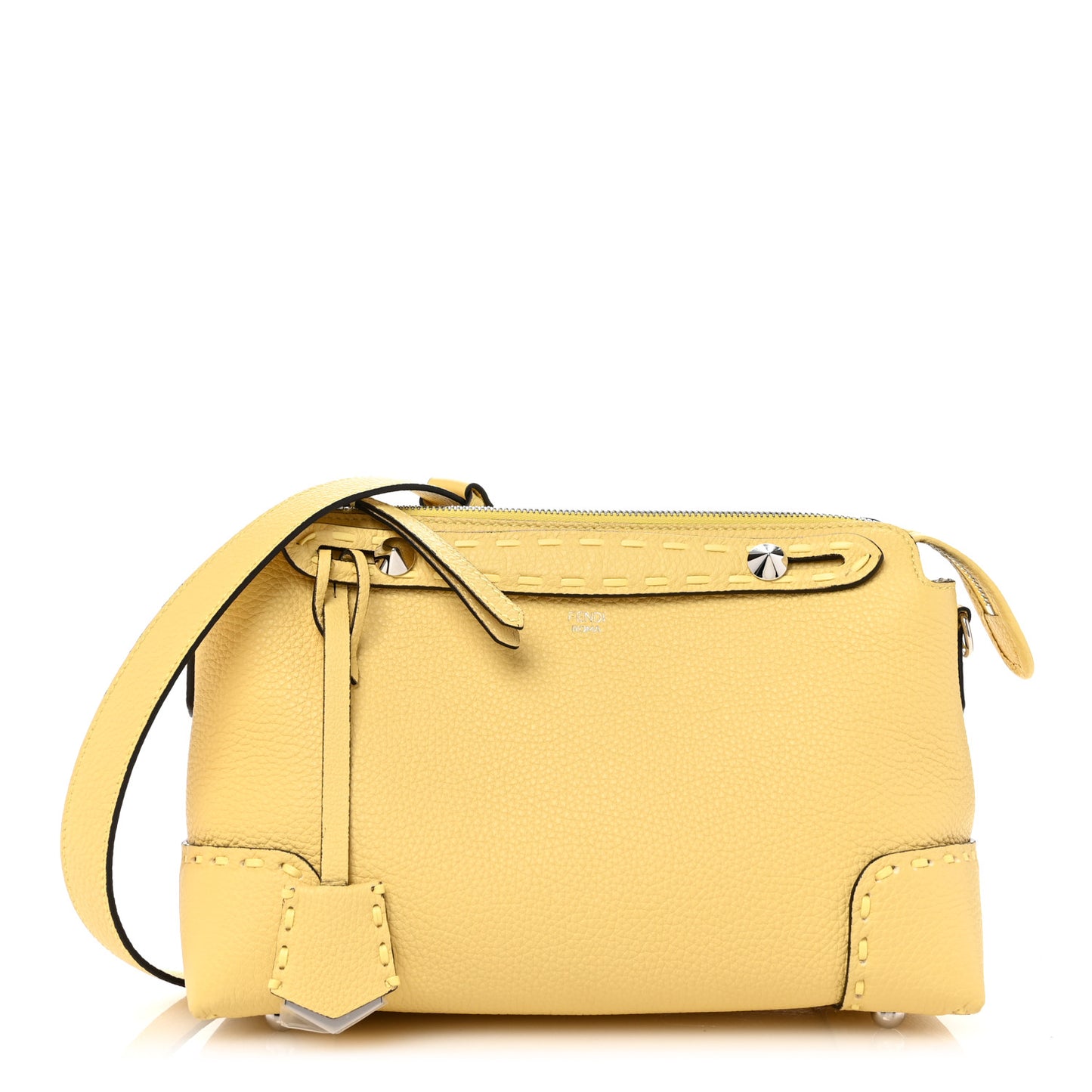 This is an authentic FENDI Cuoio Romano Sellerissima Medium By The Way Boston Bag in Sorbetto. This luxurious satchel is crafted of calfskin leather in light yellow. The bag features a matching leather shoulder strap with adjustable silver snaps. The top zipper opens to a beige fabric interior with patch pockets and a center zipper compartment.Follow this item for alerts. Fendi is a registered trademark of Fendi. FASHIONPHILE is not affiliated with Fendi.