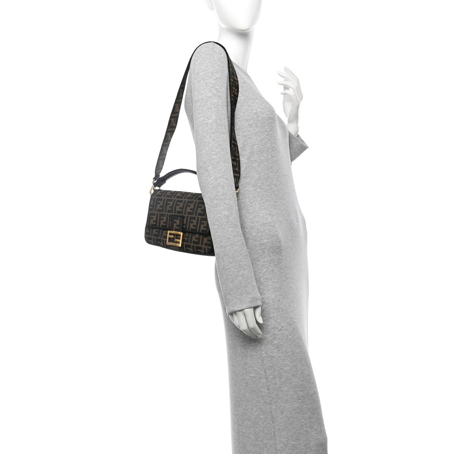 This is an authentic FENDI Fabric Jacquard FF 1974 Medium Baguette in Tobacco, Moro, and Black. This stylish shoulder bag is finely crafted of Fendi Zucca canvas in tobacco brown. The bag features a matching top handle and an optional shoulder strap with gold hardware. The crossover flap opens with a gold Fendi FF logo clasp to a FF fabric interior with a zipper pocket.Follow this item for alerts. Fendi is a registered trademark of Fendi. FASHIONPHILE is not affiliated with Fendi.