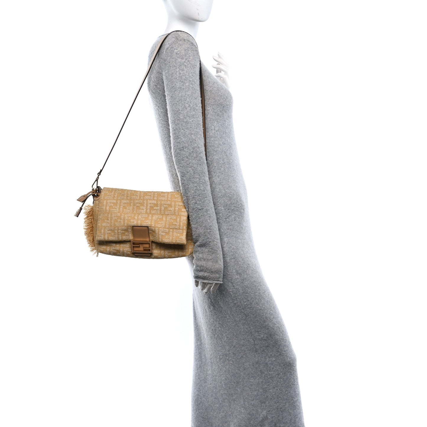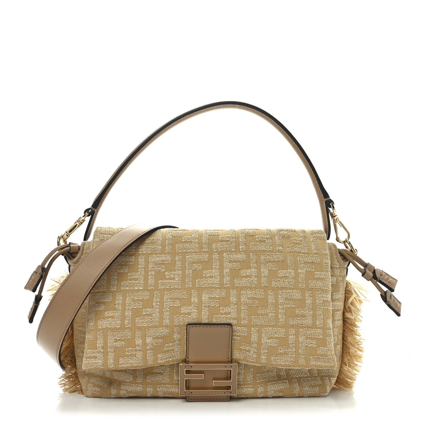 This is an authentic FENDI Fabric Jacquard Raffia Straw Fringe Medium Mamma Baguette in Beige. This updated version of the classic Mama baguette is crafted of monogram fabric and raffia in beige. It features a leather top handle with gold anchors, an optional shoulder strap, and drawstring tabs on either end that create a ruched effect. The leather and gold metal FF magnetic closure opens to a matching microfiber interior.Follow this item for alerts. Fendi is a registered trademark of Fendi. FASHIONPHILE is not affiliated with Fendi.