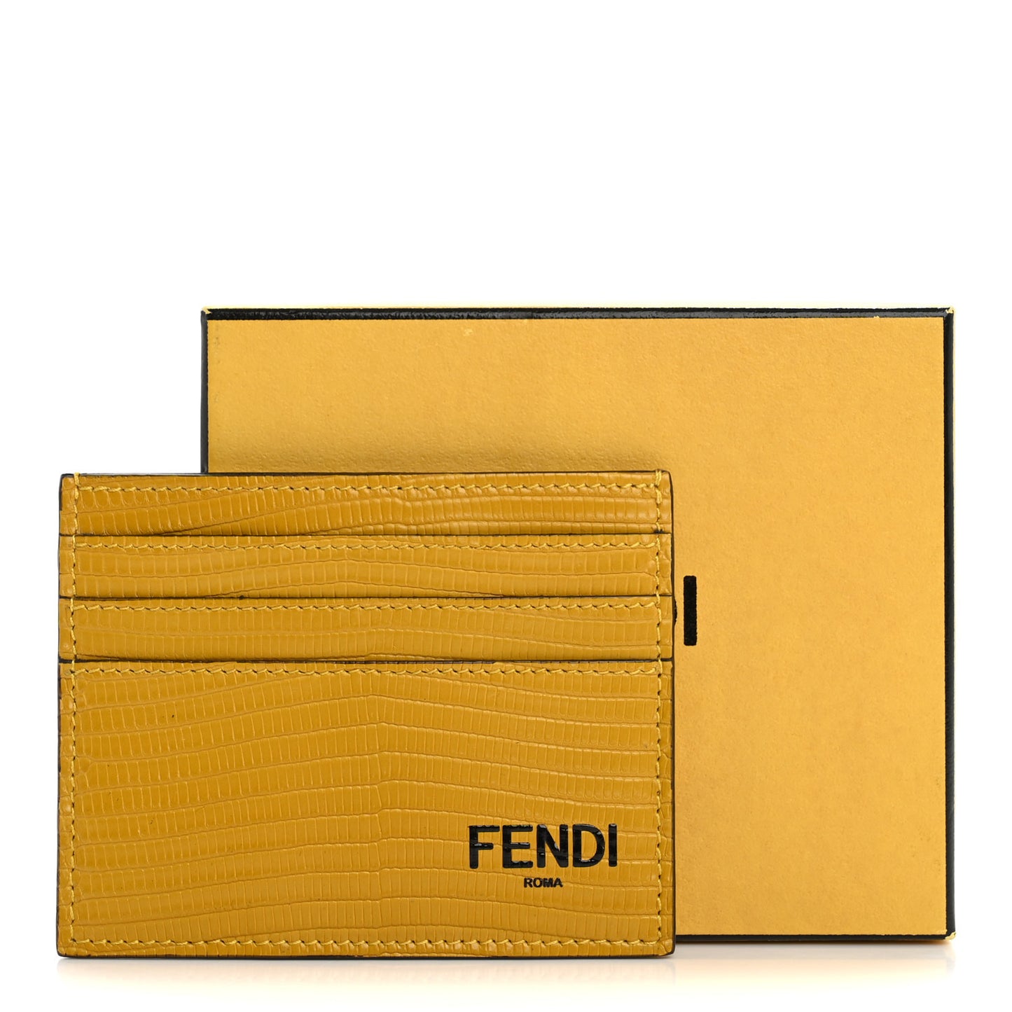 This is a guaranteed authentic FENDI Lizard Card Holder in Sunflower. This card case is crafted of beautiful textured lizard in yellow. The cardholder features three slots on either side of the main compartment.Follow this item for alerts. Fendi is a registered trademark of Fendi. FASHIONPHILE is not affiliated with Fendi.