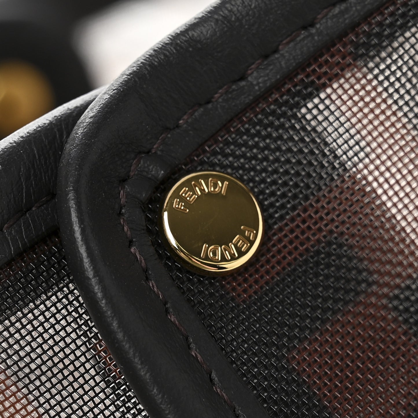 This is an authentic FENDI Mesh Vitello Century FF 1974 Mini Peekaboo Defender Cover in Marrone, Black, and Ebano. This stylish cover is crafted of Fendi logo mesh, with brown leather trim. It attaches with brass press studs on the sides and can be used to cover your mini Fendi Peekaboo to give it a classic look.Follow this item for alerts. Fendi is a registered trademark of Fendi. FASHIONPHILE is not affiliated with Fendi.