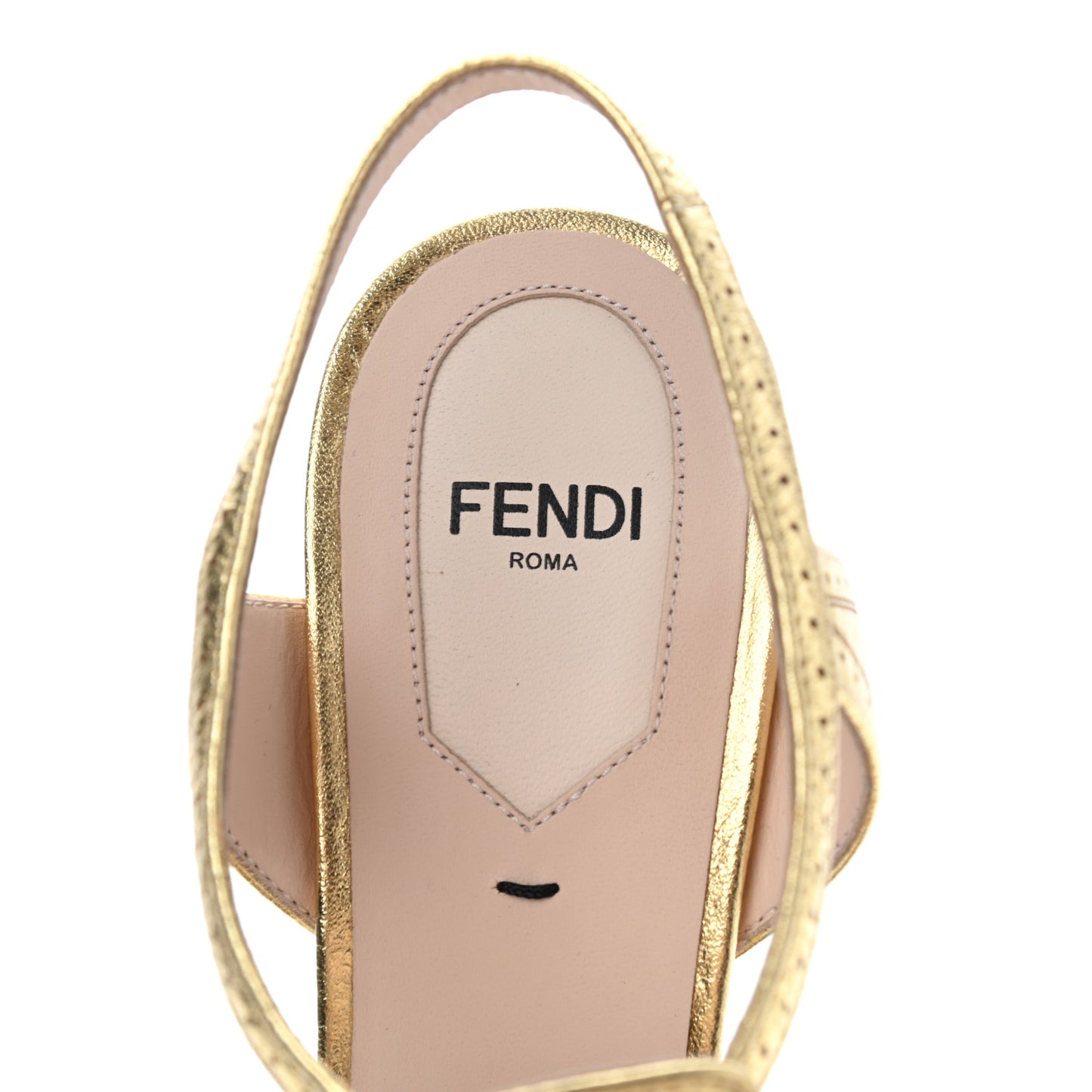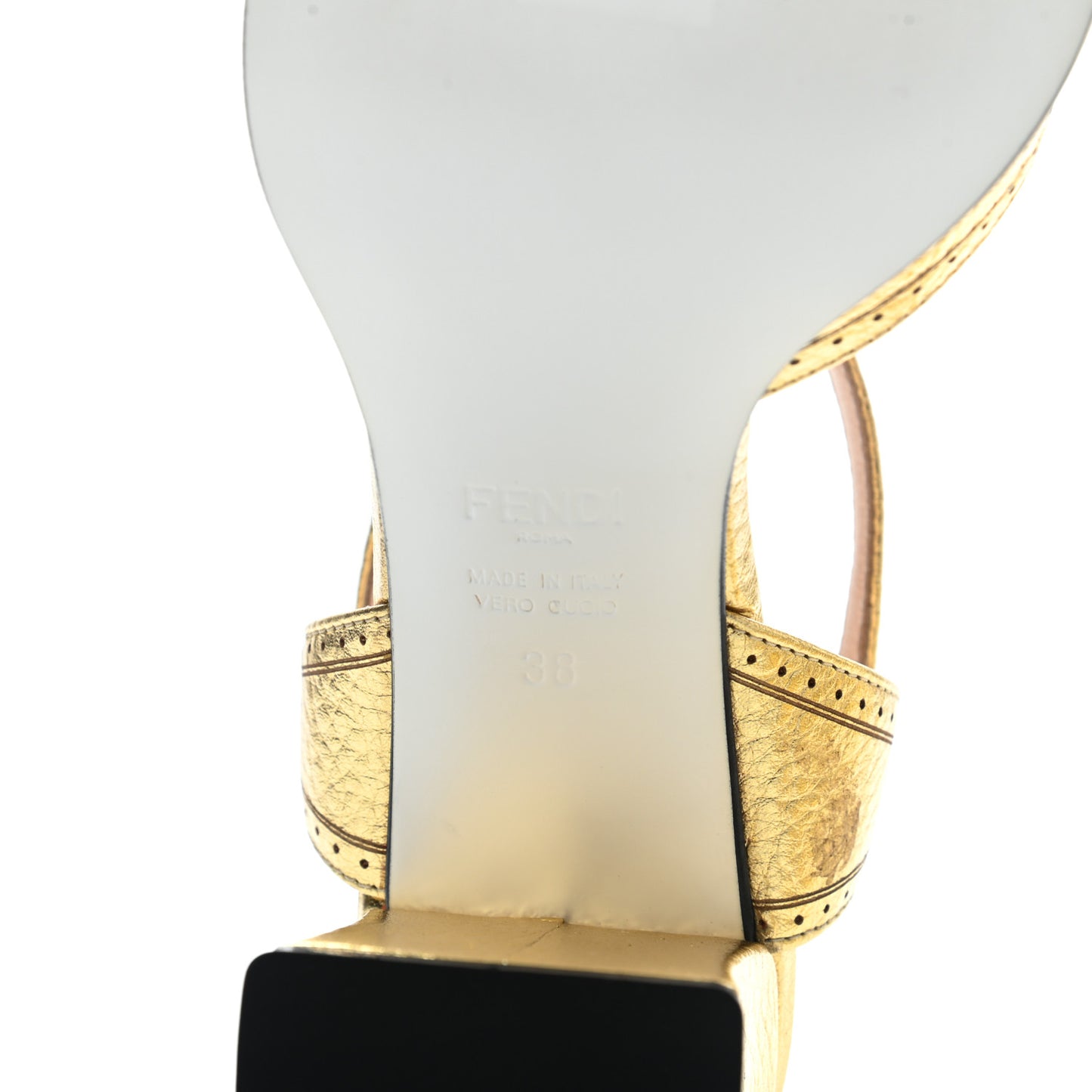 This is an authentic FENDI Metallic Calfskin Chameleon Block Heel Pumps size 38 in Gold. These pair of pumps are crafted of perforated grained calfskin leather in metallic gold. They feature peep toes, gold hardware, and wrapped 2.75 inch block heels.Follow this item for alerts. Fendi is a registered trademark of Fendi. FASHIONPHILE is not affiliated with Fendi.