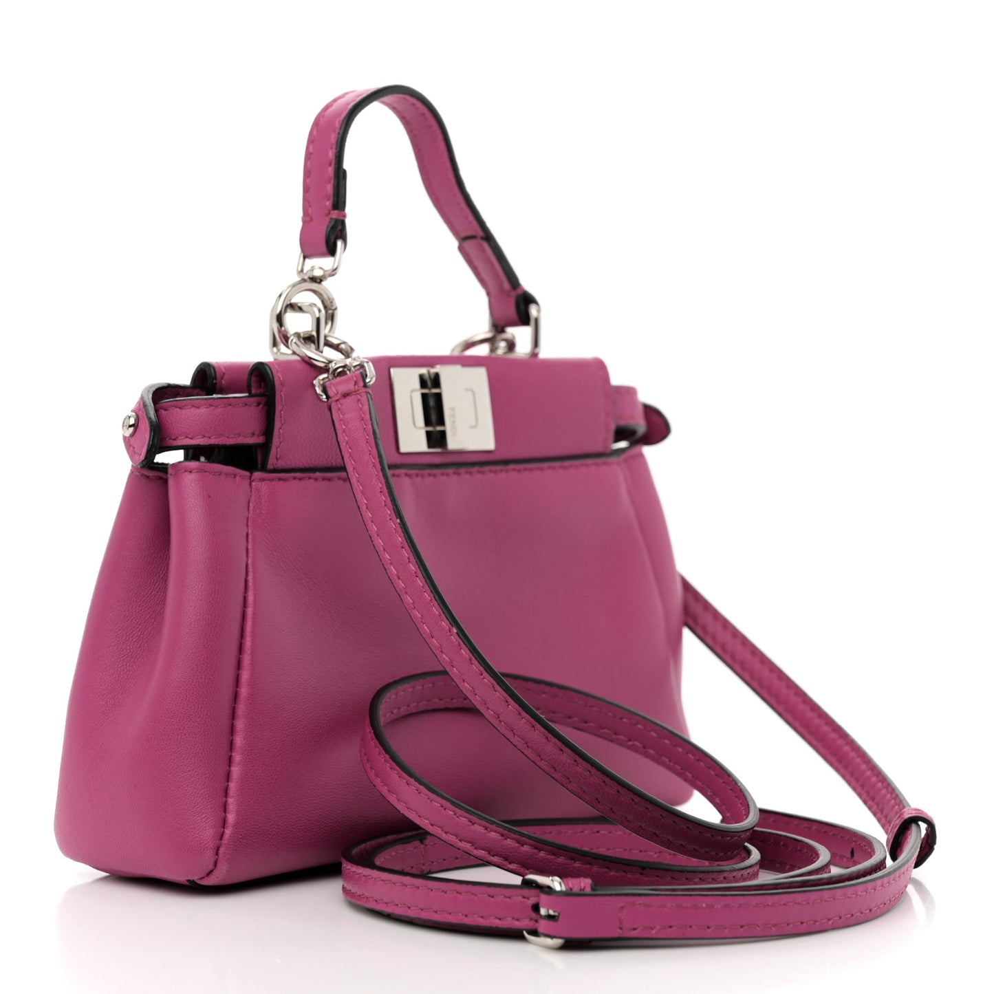 This is a stylish and authentic FENDI Shiny Nappa Nano Peekaboo Satchel in Magenta. This Peekaboo is nano size is crafted of magenta nappa leather. It features a top handle and polished silver turn lock opens to a partitioned grey interior.Follow this item for alerts. Fendi is a registered trademark of Fendi. FASHIONPHILE is not affiliated with Fendi.