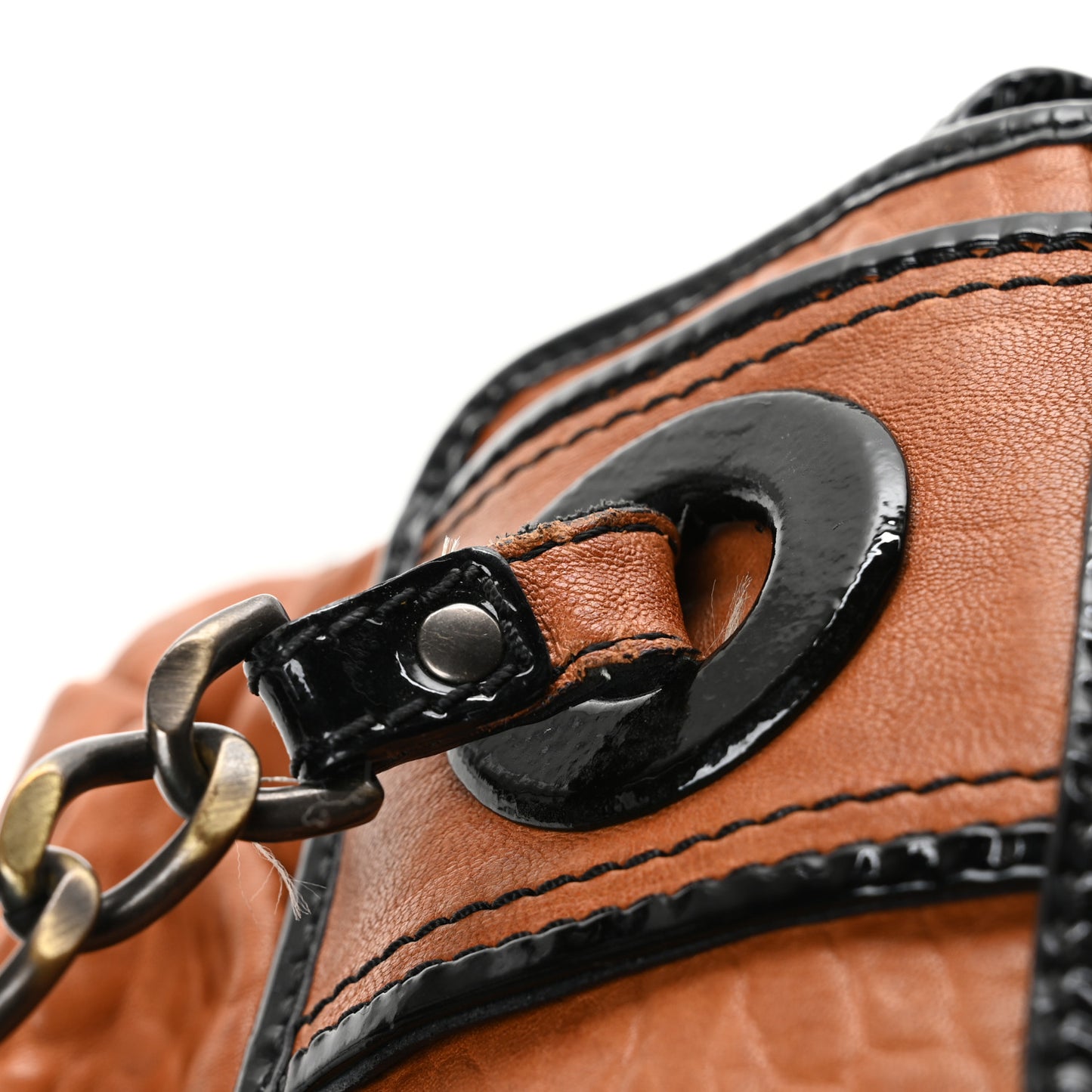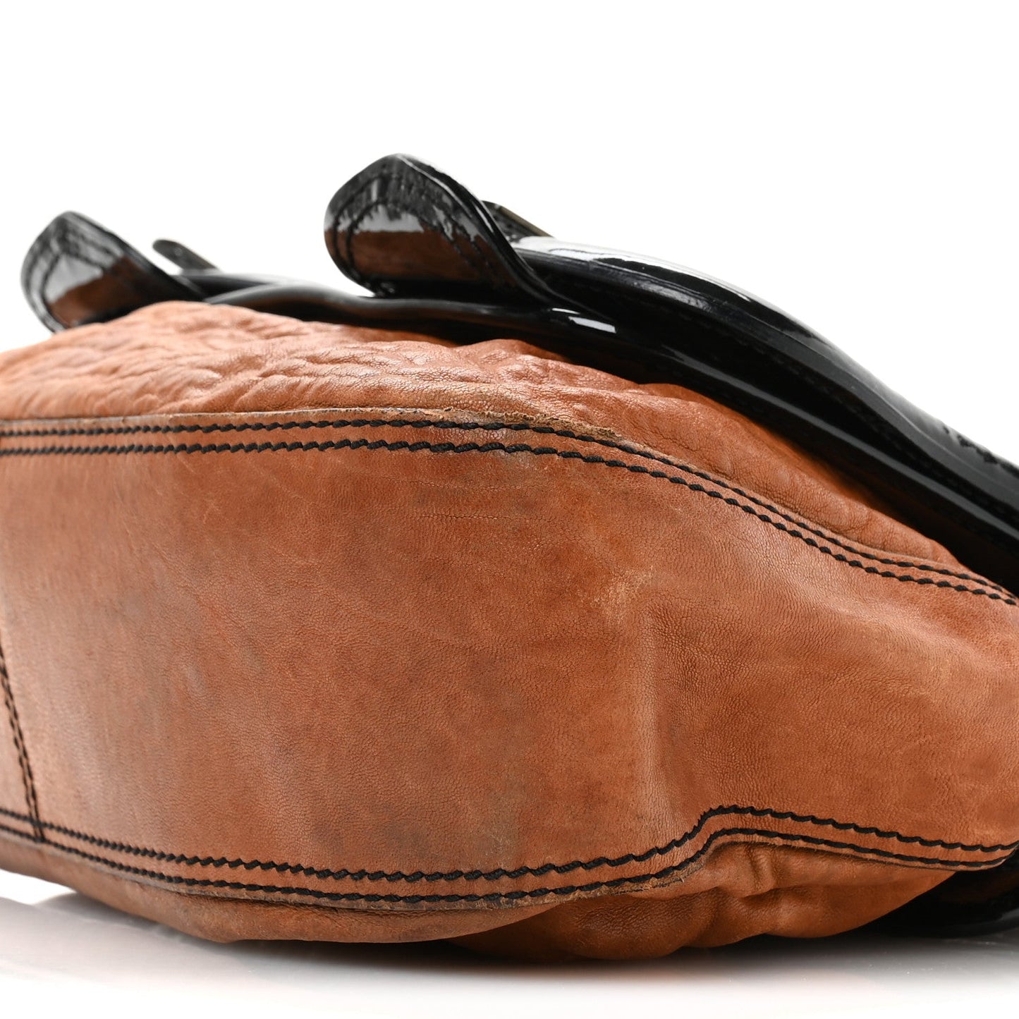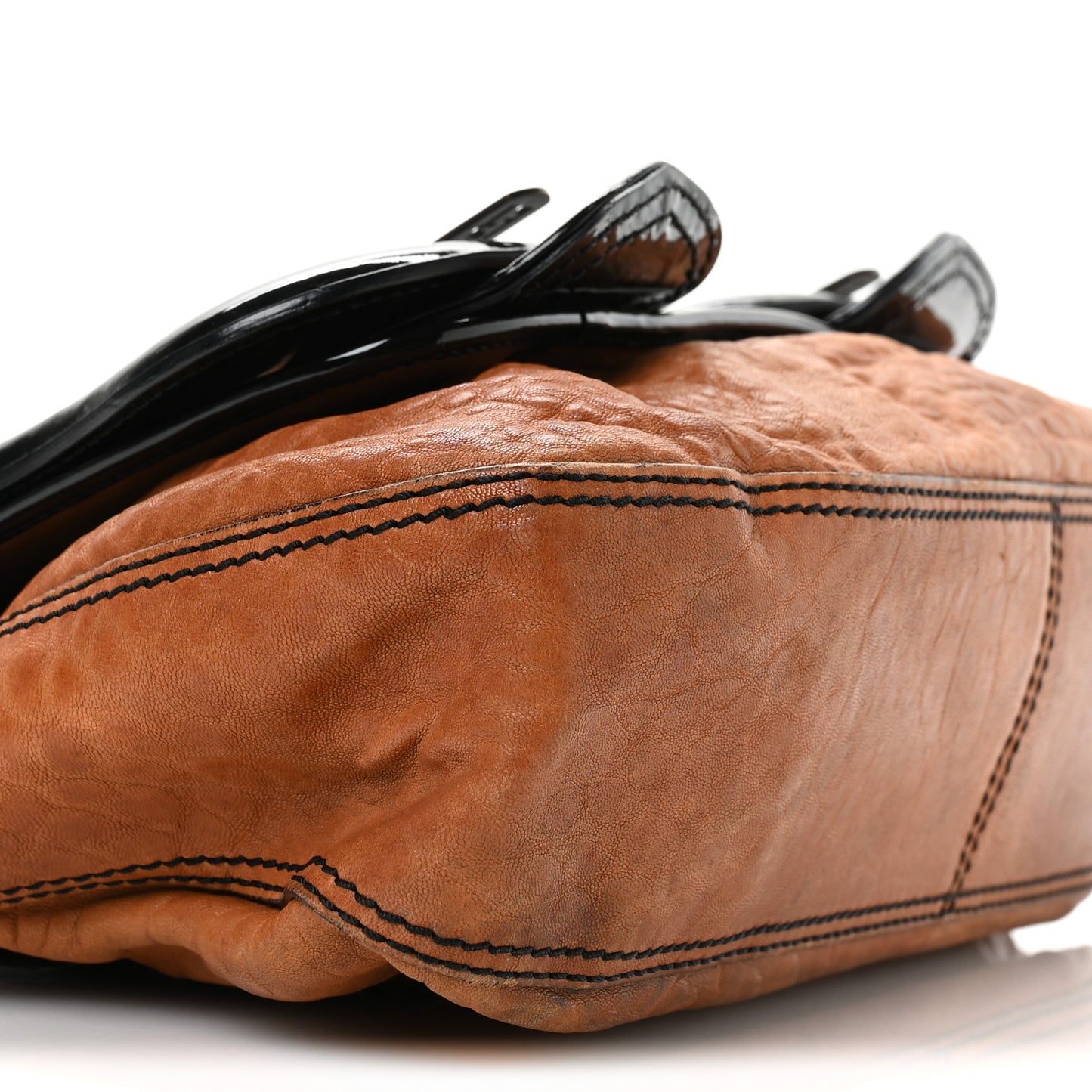 This is an authentic FENDI Nappa Patent B Bag in Osso and Black. This handbag is crafted of tan nappa leather, black patent leather trims, and antiqued brass hardware. It features chain linked handles and two large decorative buckles with FF hardware. The flap opens to a brown fabric interior with a patch pocket.Follow this item for alerts. Fendi is a registered trademark of Fendi. FASHIONPHILE is not affiliated with Fendi.