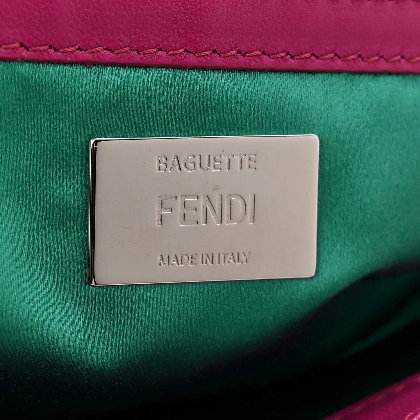 This is an authentic FENDI Sequin Paillettes Shiny Nappa Sex and the City Baguette in Fuchsia Magenta. This handbag is crafted of pink fabric covered in matching sequins. The bag features a pink leather top handle, an optional leather shoulder strap, and a silver Fendi FF logo on the crossover flap. This opens to a green satin fabric interior and a zipper pocket.Follow this item for alerts. Fendi is a registered trademark of Fendi. FASHIONPHILE is not affiliated with Fendi.