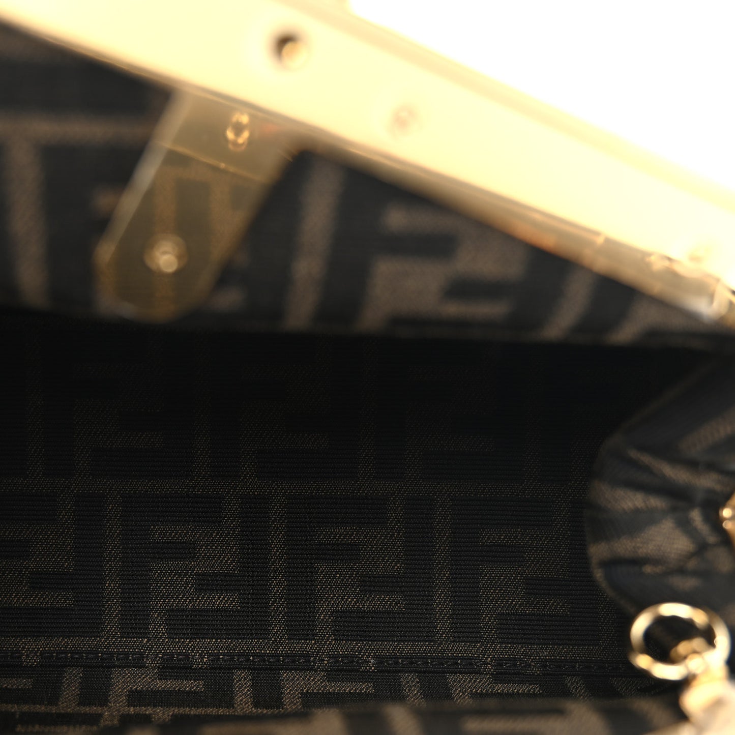 This is an authentic FENDI Shiny Nappa Small Fendi First in Dove Gray. This unique clutch is crafted of beige lambskin leather with a structured F frame at the top. The bag features a removable adjustable leather crossbody strap and opens with a press lock to a FF logo fabric interior.Follow this item for alerts. Fendi is a registered trademark of Fendi. FASHIONPHILE is not affiliated with Fendi.