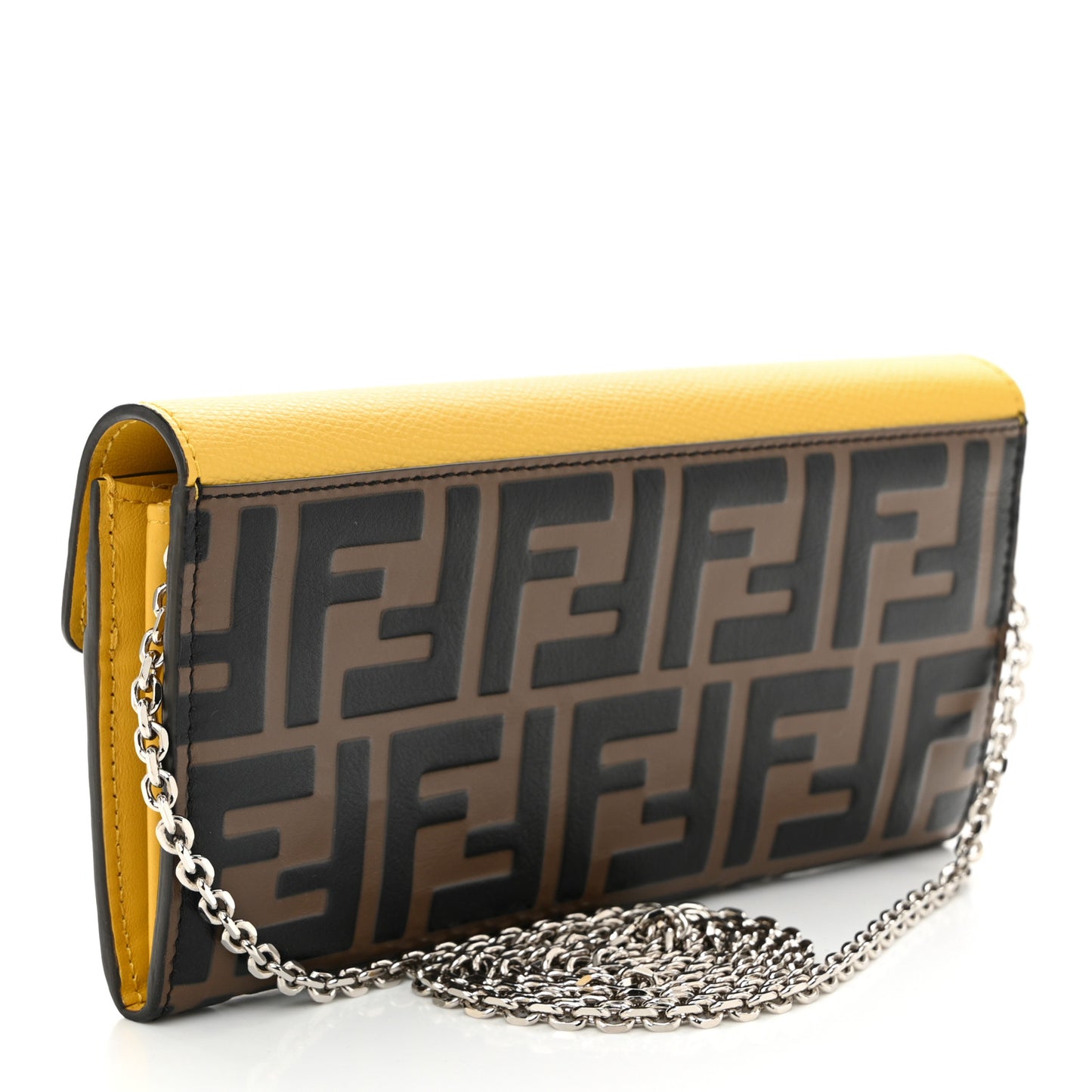 This is an authentic FENDI Vitello Cruise F is Fendi Bi-Color FF 1974 Embossed Continental Envelope Wallet On Chain in Maya and Yellow. This delightful wallet is crafted of FF embossed calfskin leather in brown with a yellow flap. This wallet features an optional silver chain-link strap and a Fendi logo in silver. The flap opens to a black leather interior with card slots, patch pockets, and a zipper compartment.Follow this item for alerts. Fendi is a registered trademark of Fendi. FASHIONPHILE is not affiliated with Fendi.