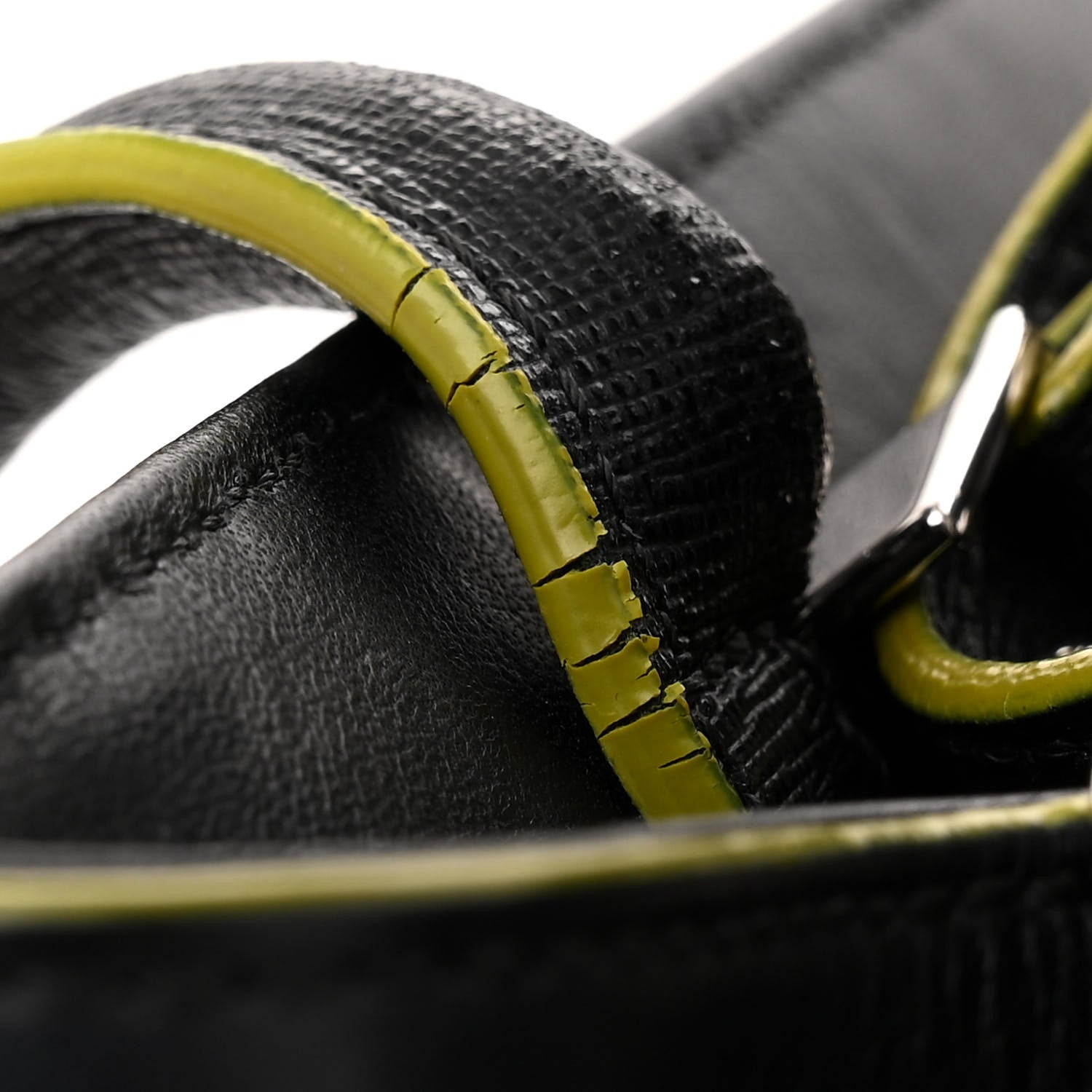 This is an authentic FENDI Vitello Elite Apple Charm Petite 2Jours Tote in Black. This chic tote is crafted of multi textured calfskin leather in black. The shoulder bag features rolled leather top handles, neon lime trim, an optional adjustable shoulder strap and smooth expansive sides with a polished silver top frame and a wide open top. The bag features a matching leather tag charm and a fuzzy apple charm. The top frame unsnaps to a partitioned black fabric interior with a central zipper pocket.Follow this item for alerts. Fendi is a registered trademark of Fendi. FASHIONPHILE is not affiliated with Fendi.
