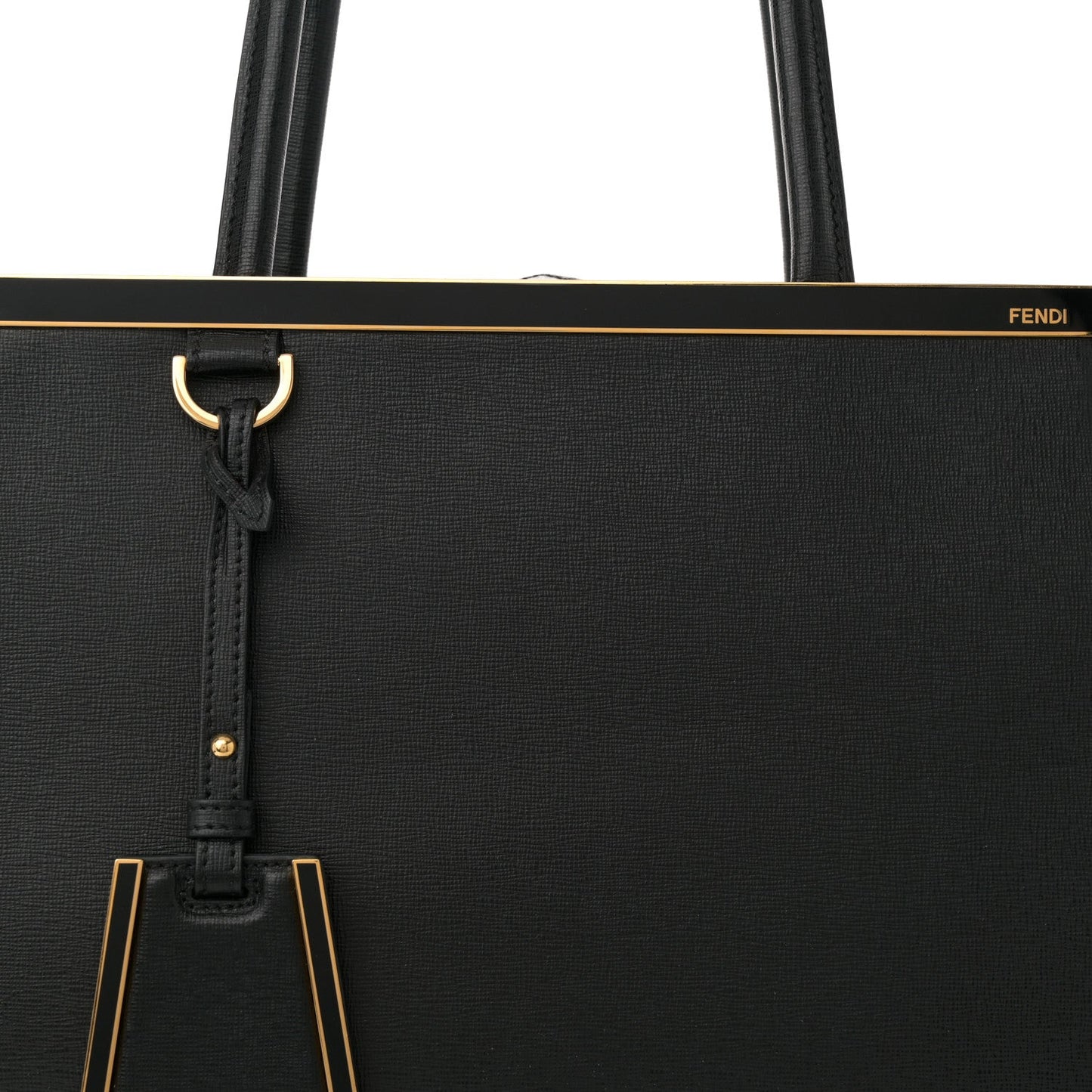 This is an authentic FENDI Vitello Elite Large 2Jours Tote in Black. This tote is crafted of multi textured calfskin leather in black. The shoulder bag features rolled leather top handles, smooth expansive sides, a polished brass top frame and a wide open top. The top frame unsnaps to a partitioned striped black fabric interior with a pocket.Follow this item for alerts. Fendi is a registered trademark of Fendi. FASHIONPHILE is not affiliated with Fendi.