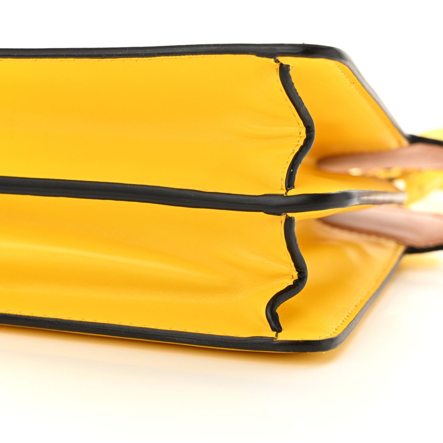This is an authentic FENDI Vitello King Luxor Shiny Nappa Medium Peekaboo I SEE U East West Satchel in Limone and Light Rose. This stylish bag is crafted of soft calfskin leather in black. The bag features a top handle, an optional shoulder strap, and gold hardware including Fendi logo turn locks on either side. These open to a partitioned pink leather interior with a snap pocket.Follow this item for alerts. Fendi is a registered trademark of Fendi. FASHIONPHILE is not affiliated with Fendi.