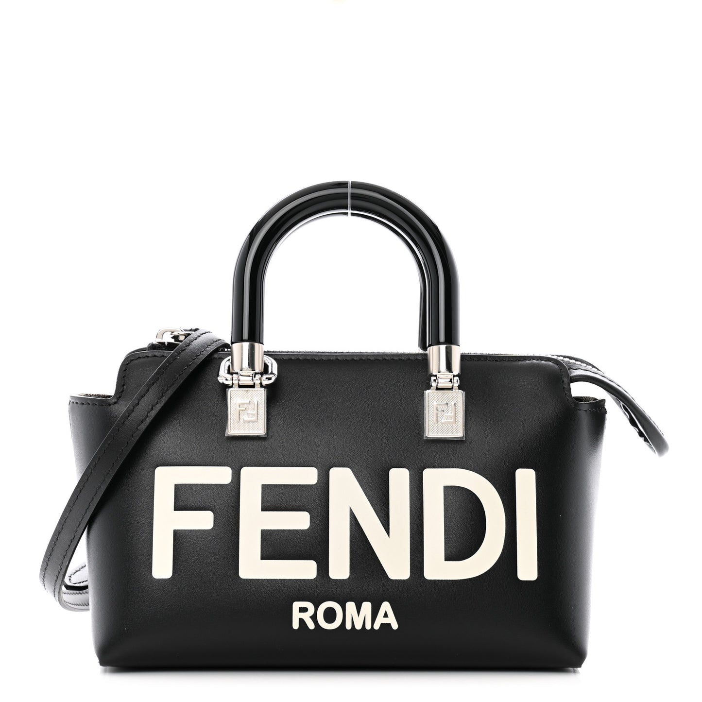 This is an authentic FENDI Vitello King Plexiglass Logo Embossed Mini By The Way Top Handle Boston Bag in Black and White. This chic satchel is finely crafted of smooth calfskin leather in black. The shoulder bag features black plexiglass top handles and a leather shoulder strap with silver-tone hardware. The top zipper opens to a logo jacquard interior with a patch pocket.Follow this item for alerts. Fendi is a registered trademark of Fendi. FASHIONPHILE is not affiliated with Fendi.