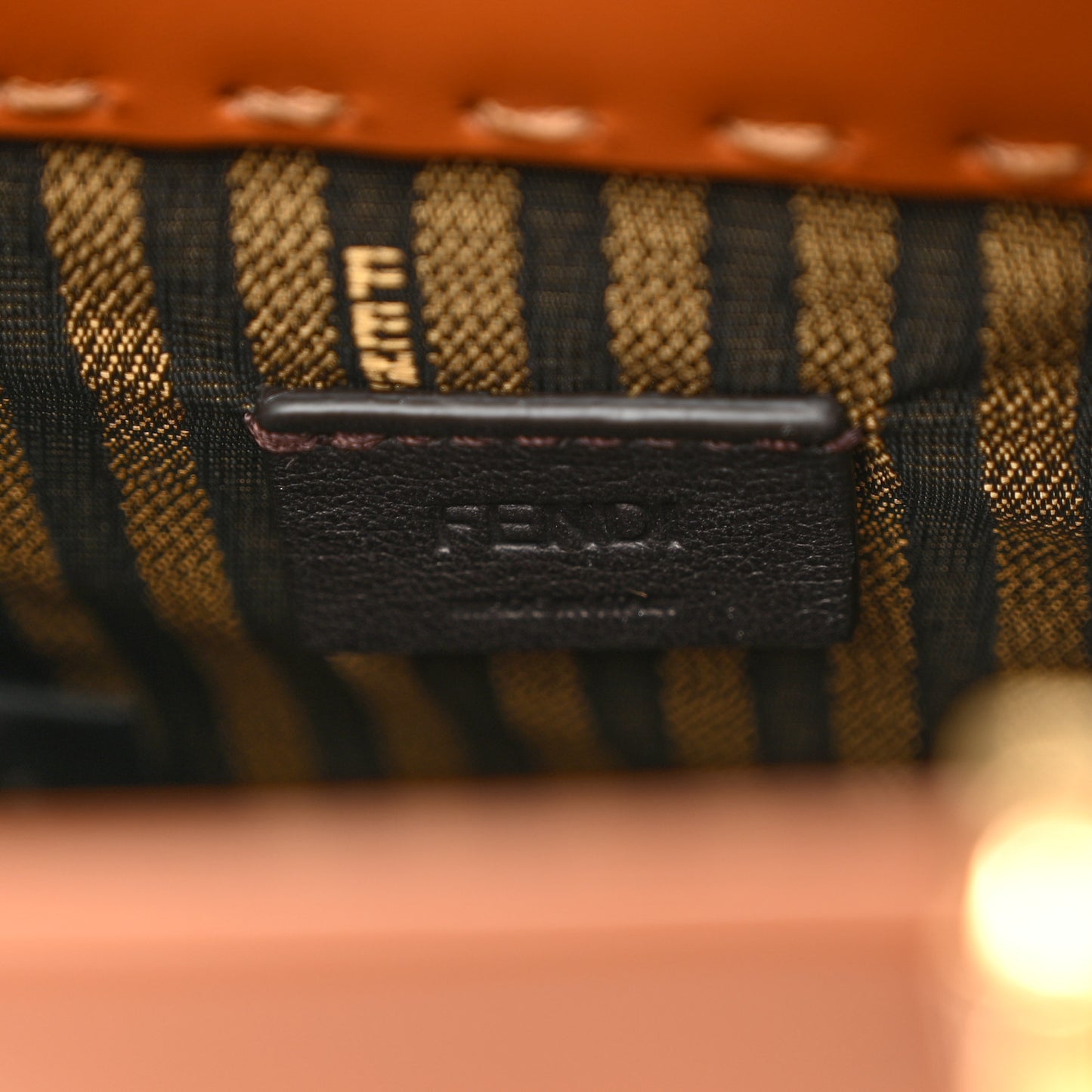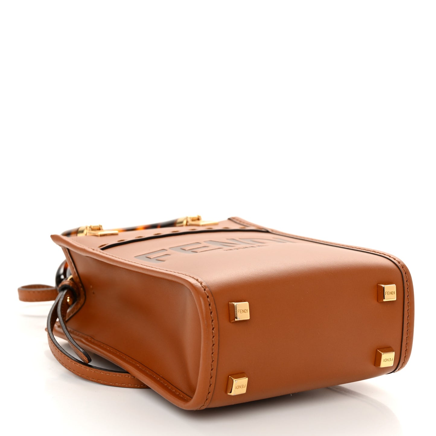This is an authentic FENDI Vitello King Plexiglass Logo Embossed Mini Fendi Sunshine Shopper Tote in Cuoio. This stylish shopping shoulder bag is crafted in tan calfskin leather with stitched detailing. The crossbody features resin tortoiseshell top handles, an optional shoulder strap, gold hardware and a bold, embossed Fendi logo. The top opens to a striped fabric interior.Follow this item for alerts. Fendi is a registered trademark of Fendi. FASHIONPHILE is not affiliated with Fendi.