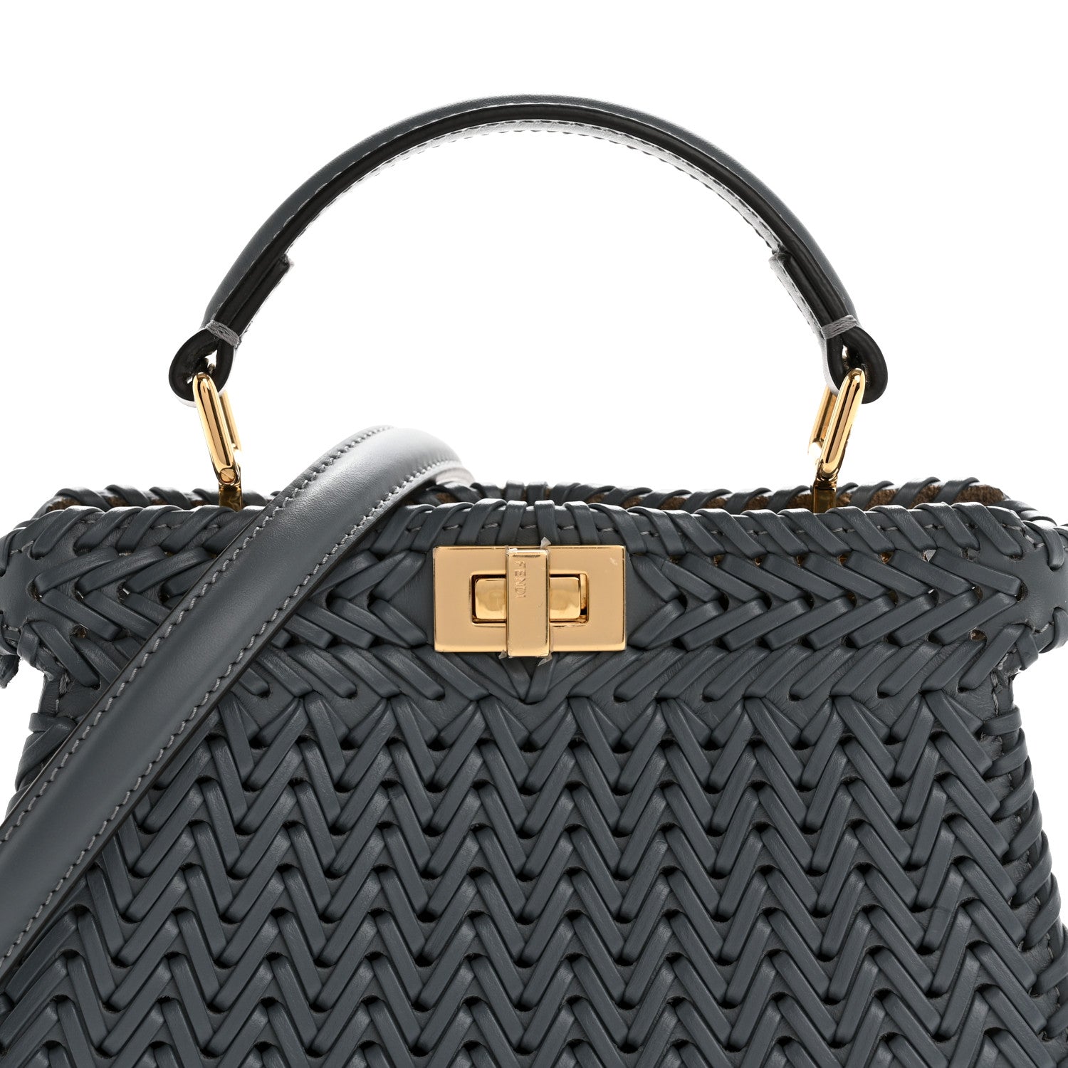 This is an authentic FENDI Vitello King Shiny Nappa Intreccio Petite Peekaboo I SEE U Satchel in Tempesta. This chic tote is finely crafted of grey calfskin leather. This mini-sized bag features gold squared turn locks on either side that when released, relax the outer layer to reveal the inner panel of grey leather and beige suede with a gold metal bar. It can be carried as a shoulder bag with the optional adjustable shoulder strap or a tote by the top handle.Follow this item for alerts. Fendi is a registered trademark of Fendi. FASHIONPHILE is not affiliated with Fendi.