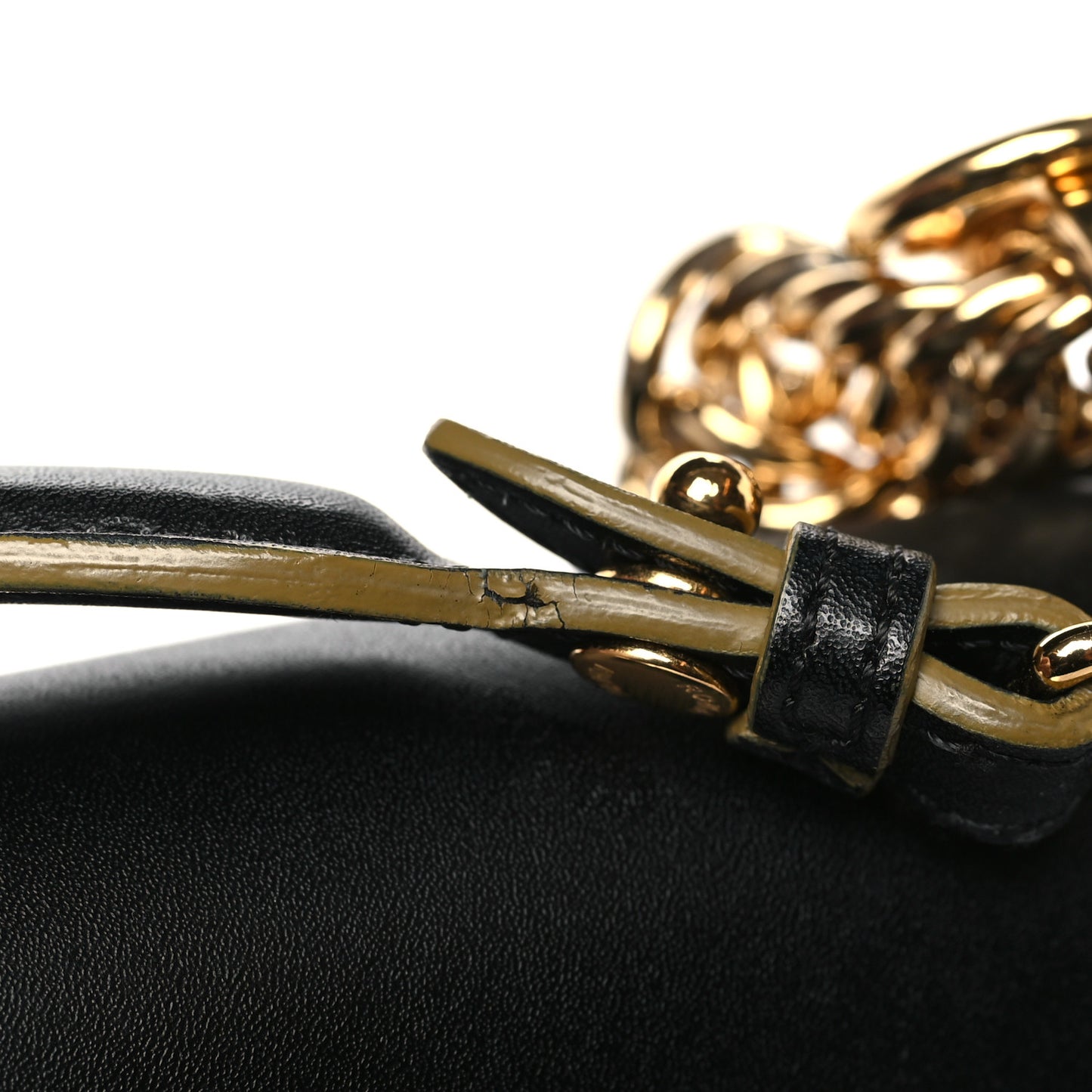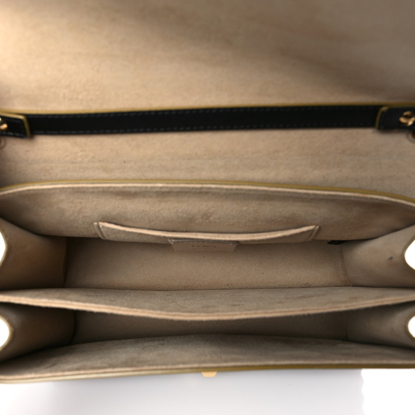 This is an authentic FENDI Vitello Liberty Scalloped Studded Kan I Shoulder Bag in Black. This chic top handle bag is crafted of calfskin leather in black. It features contrasting scalloped edging, a detachable leather top handle, a gold chain shoulder strap with a leather shoulder pad, and a front flap with double plexiglass stud closure. This opens to a partitioned beige suede interior with a pocket.Follow this item for alerts. Fendi is a registered trademark of Fendi. FASHIONPHILE is not affiliated with Fendi.