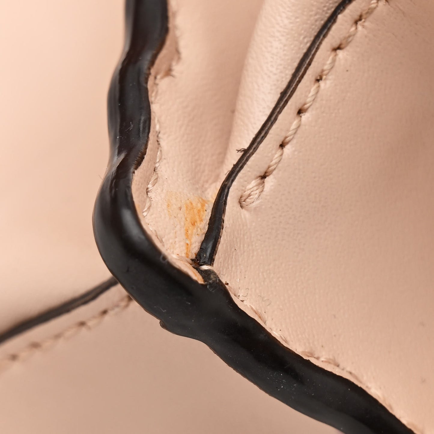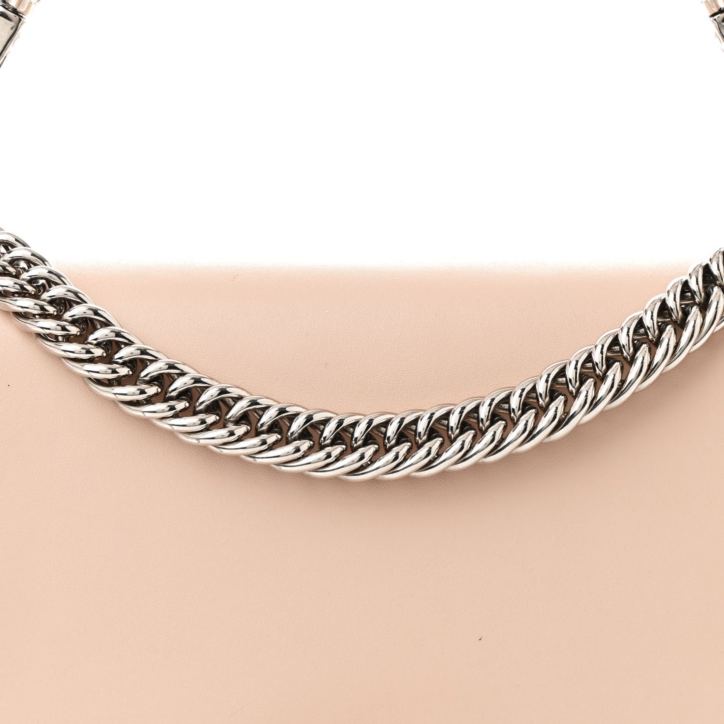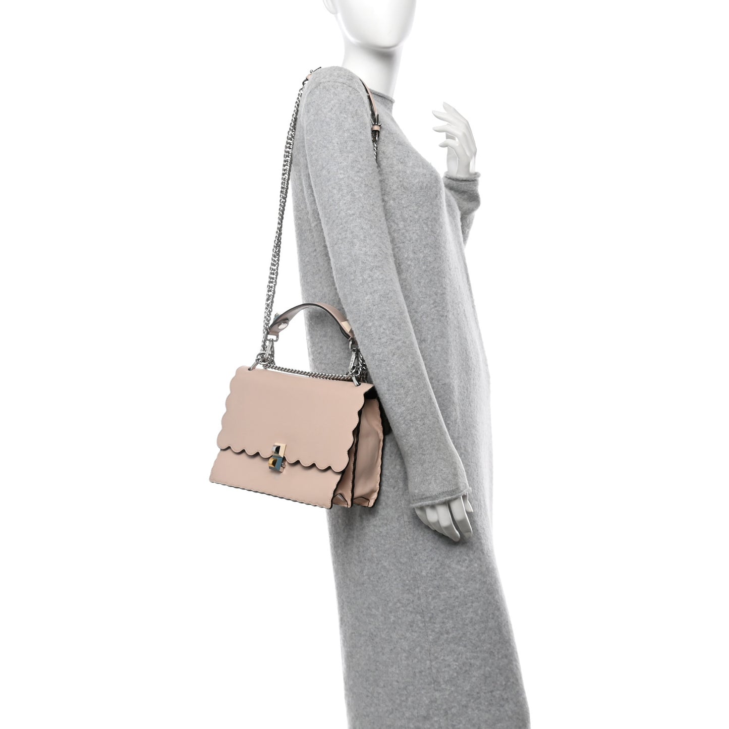 This is an authentic FENDI Vitello Liberty Scalloped Studded Kan I Shoulder Bag in Plaster. This shoulder bag is crafted of smooth calfskin leather in light pink with brown resin glazed scalloped edges. This shoulder bag features a top handle, a long polished silver chain-link strap with a shoulder pad, and silver rings on the anchor to hold bag charms. The front flap has a decorative pastel blue, silver and pastel salmon, gold-tone pyramid stud closure. The front opens to a partitioned suede interior with a flat pocket.Follow this item for alerts. Fendi is a registered trademark of Fendi. FASHIONPHILE is not affiliated with Fendi.