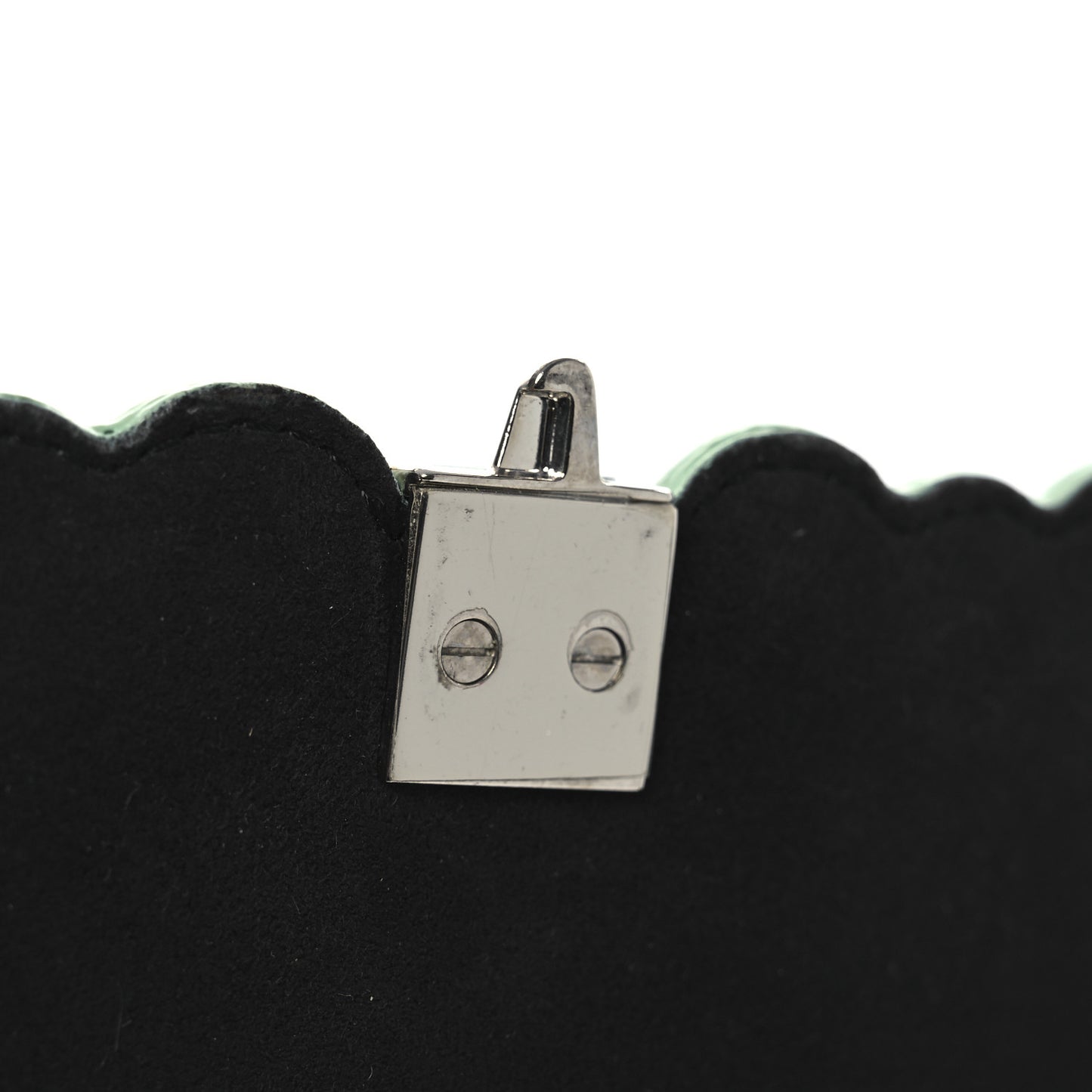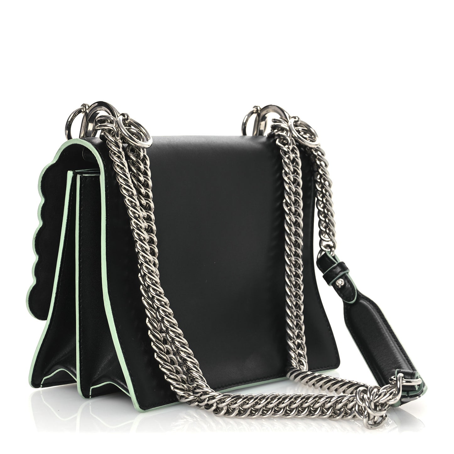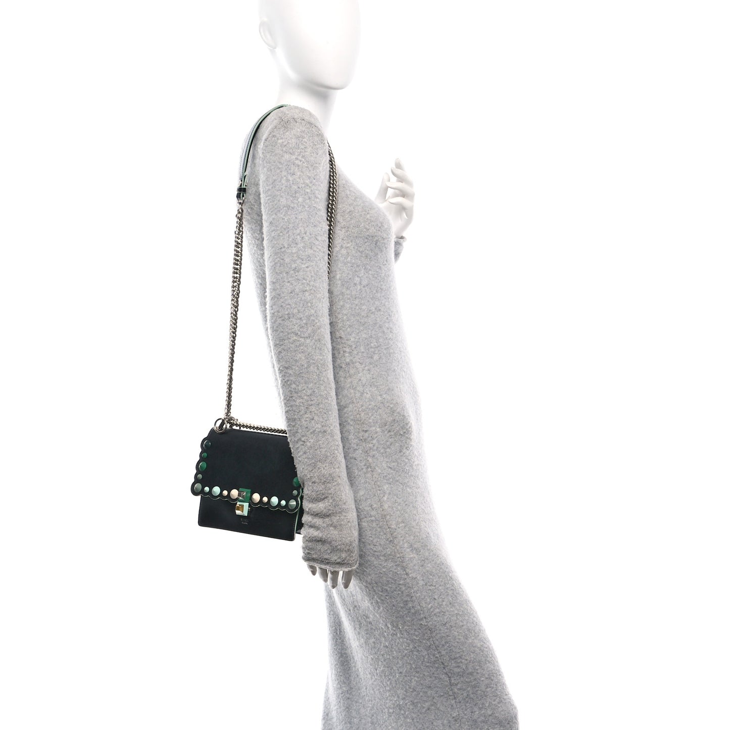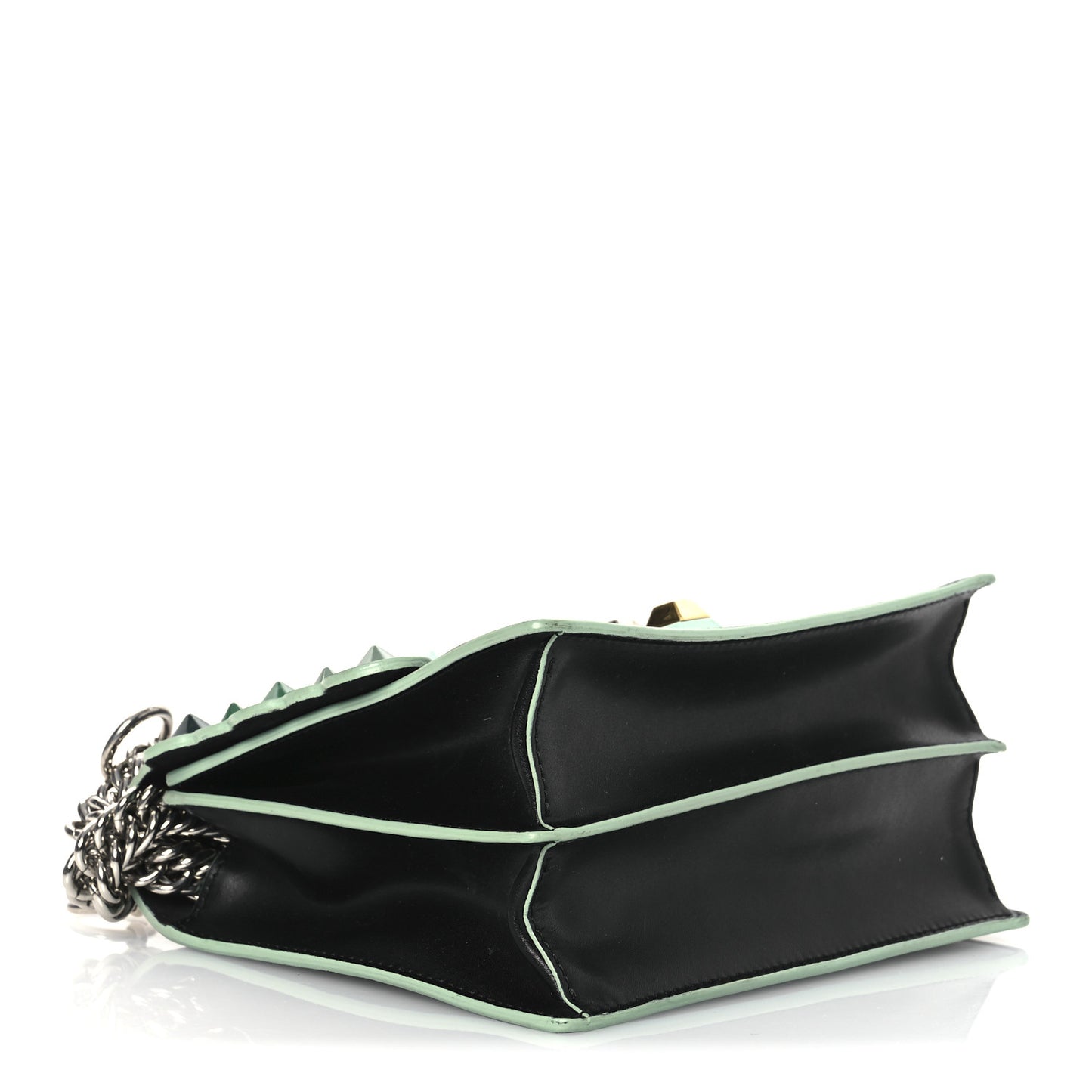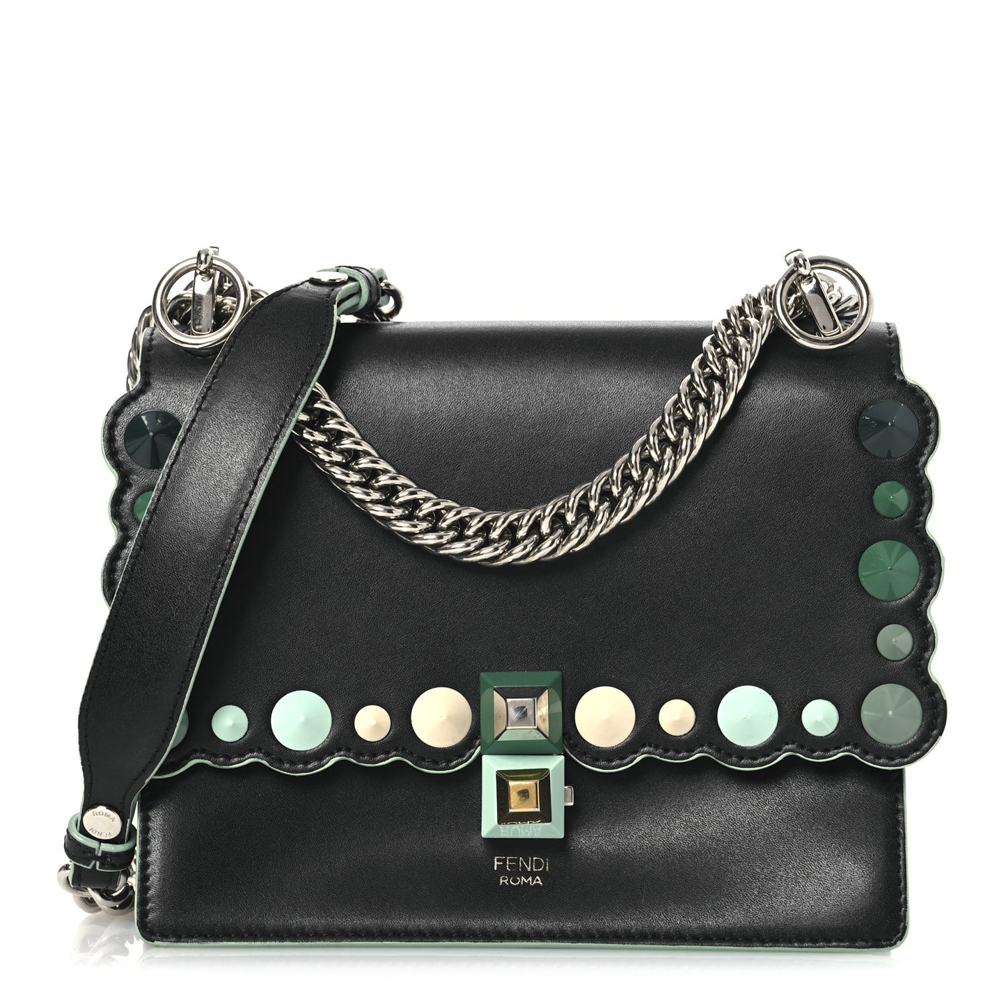 This is an authentic FENDI Calfskin Scalloped Studded Small Kan I Shoulder Bag in Black and Multicolor. This shoulder bag is crafted of smooth leather in black with green scalloped edges and cone studs. This shoulder bag features a long polished pewter chain link strap with a shoulder pad and silver rings on the anchor to hold bag charms. The front flap has a decorative green, silver, gray, and gold tone pyramid stud closure. The front opens to a black suede partitioned interior with a patch pocket. This crossbody is ideal for day or evening use, from Fendi!Follow this item for alerts. Fendi is a registered trademark of Fendi. FASHIONPHILE is not affiliated with Fendi.