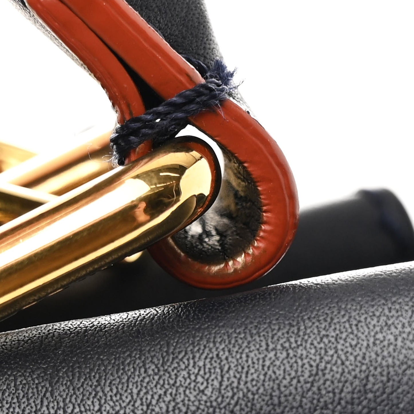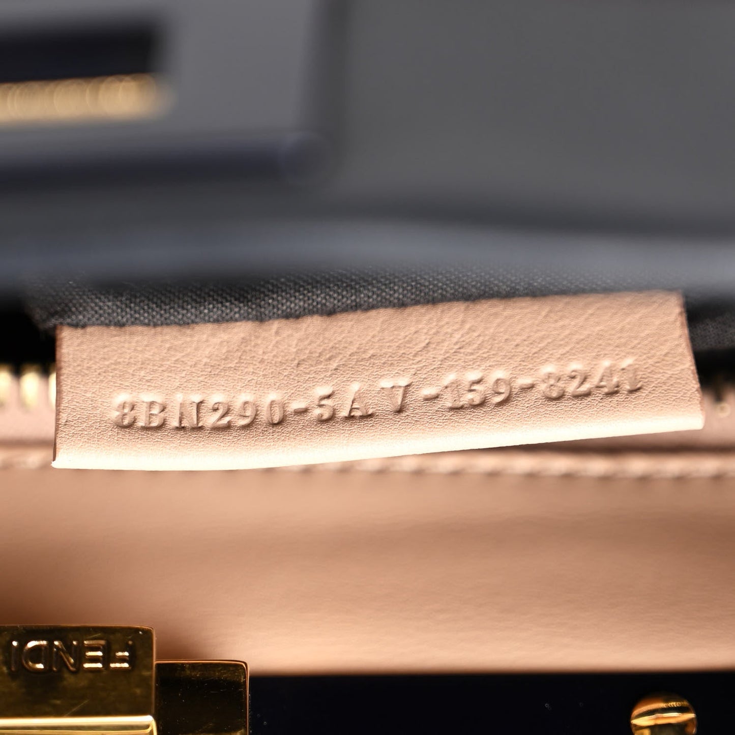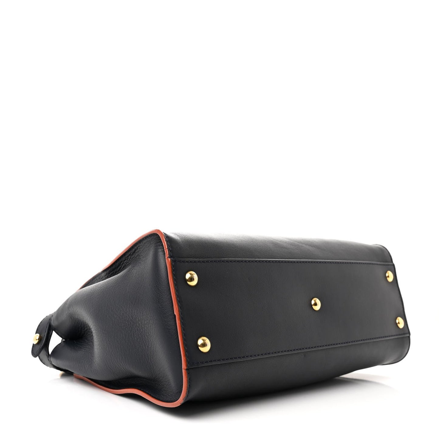 This is an authentic FENDI Silk Calfskin Medium Peekaboo Iconic Satchel in Blue Notte and Plaster. This stylish handmade tote is crafted of richly grained calfskin leather in navy blue and orange trim. The bag features a gold turn lock that when released relaxes the outer shell and is carried by the leather top handle. The bag has a beige partition interior with a central panel for both top handles and everyday essentials.Follow this item for alerts. Fendi is a registered trademark of Fendi. FASHIONPHILE is not affiliated with Fendi.