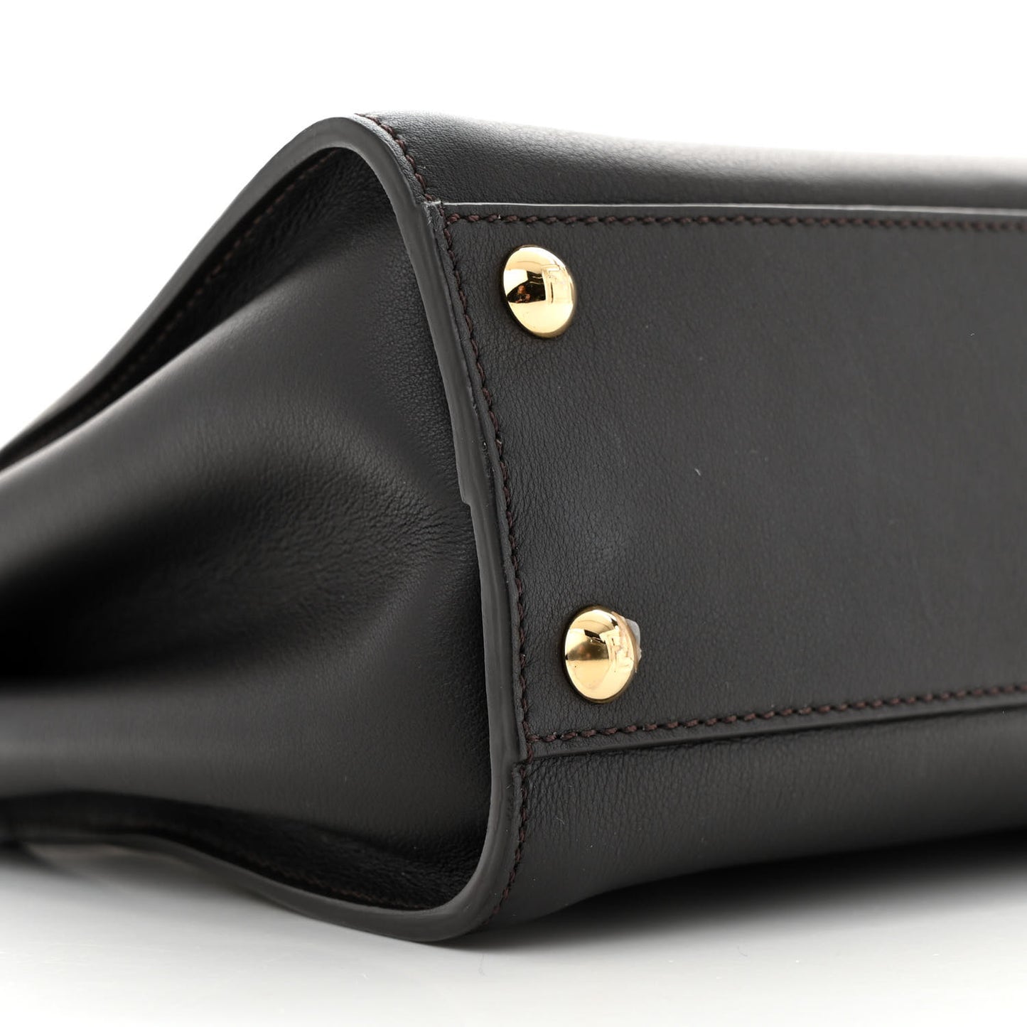 This is an authentic FENDI Vitello Seta Nabuk Pequin Mini Peekaboo Iconic Satchel in Ebano, Tobacco, and Moro. This stylish handbag is crafted of soft calfskin leather in dark brown. It features a leather top handle and gold Fendi logo turn locks. This opens to a partitioned pequin striped brown interior with patch and zipper pockets.Follow this item for alerts. Fendi is a registered trademark of Fendi. FASHIONPHILE is not affiliated with Fendi.