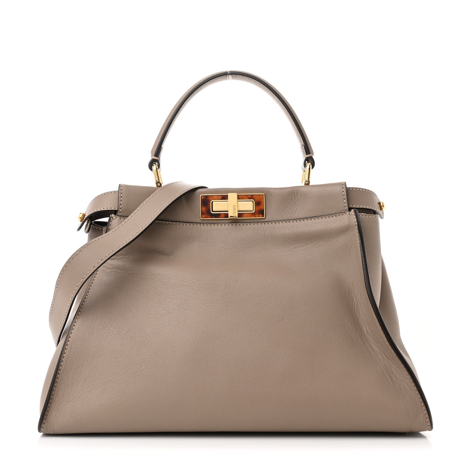 This is an authentic FENDI Vitello Seta Shiny Nappa Plexiglass Medium Peekaboo I SEE U Satchel in Tortora. This tote is crafted of gray calfskin leather. This medium-sized bag features gold and tortoise squared turn locks on either side that when released, relax the outer layer to reveal the inner panel of a brown microfiber interior with a zipper pocket.Follow this item for alerts. Fendi is a registered trademark of Fendi. FASHIONPHILE is not affiliated with Fendi.