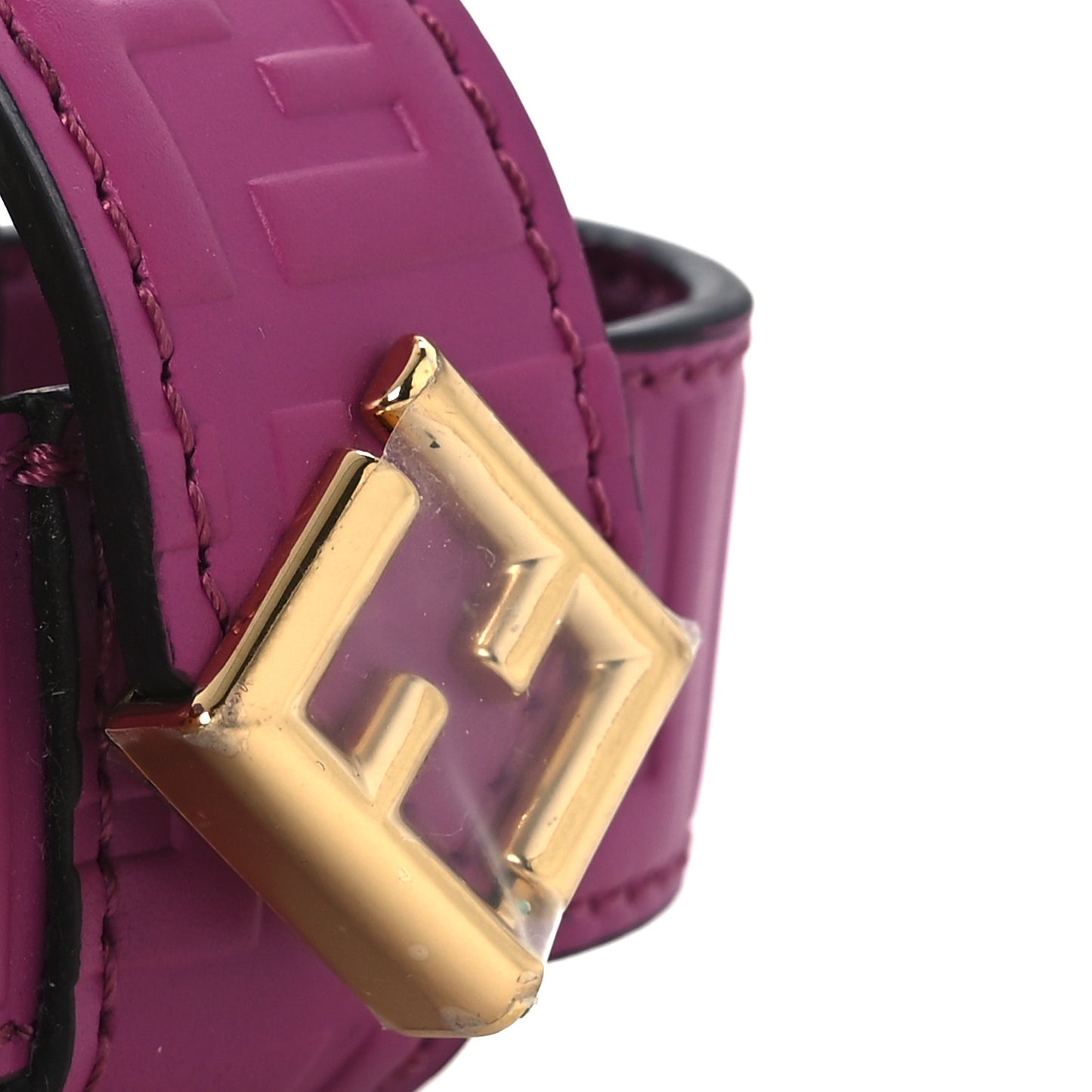 This is an authentic FENDI Vitello Soft F is Fendi AirPods Charm in Pink. This practical headphones holder is crafted of pink calfskin leather with a gold key ring. The front flaps features gold FF logo hardware and opens with a snap to a striped fabric interior.Follow this item for alerts. Fendi is a registered trademark of Fendi. FASHIONPHILE is not affiliated with Fendi.