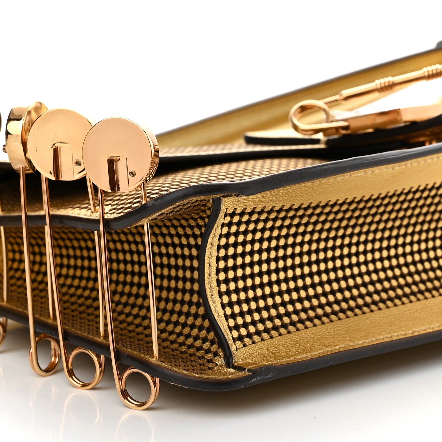 X VERSACE Metallic Nappa Perforated Fendace Brooch Baguette Gold