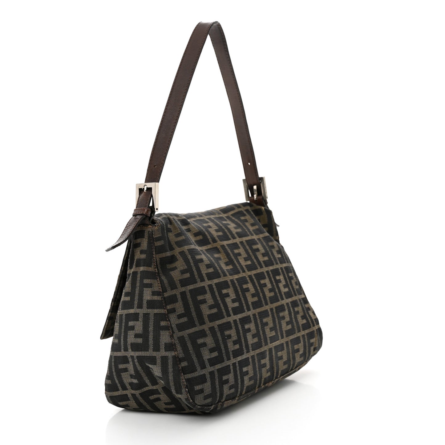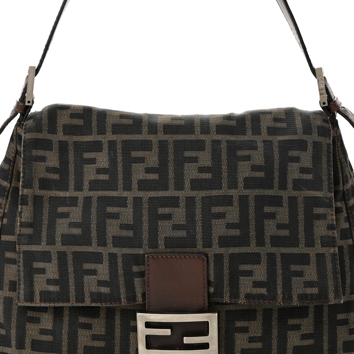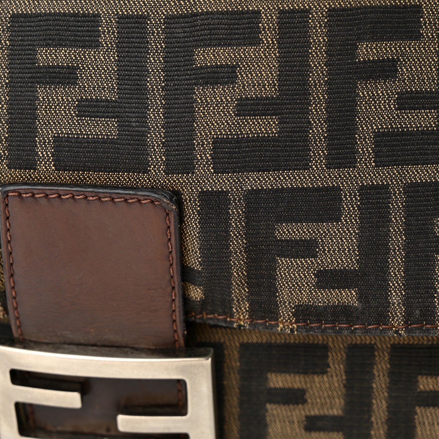 This is an authentic FENDI Zucca Big Forever Mama Baguette in Tobacco. This stylish shoulder bag is finely crafted of Fendi Zucca canvas in tobacco brown. The bag features an adjustable chocolate brown leather shoulder strap and a facing flap with a polished silver Fendi FF logo. The flap opens to a brown fabric interior with a zipper pocket.Follow this item for alerts. Fendi is a registered trademark of Fendi. FASHIONPHILE is not affiliated with Fendi.