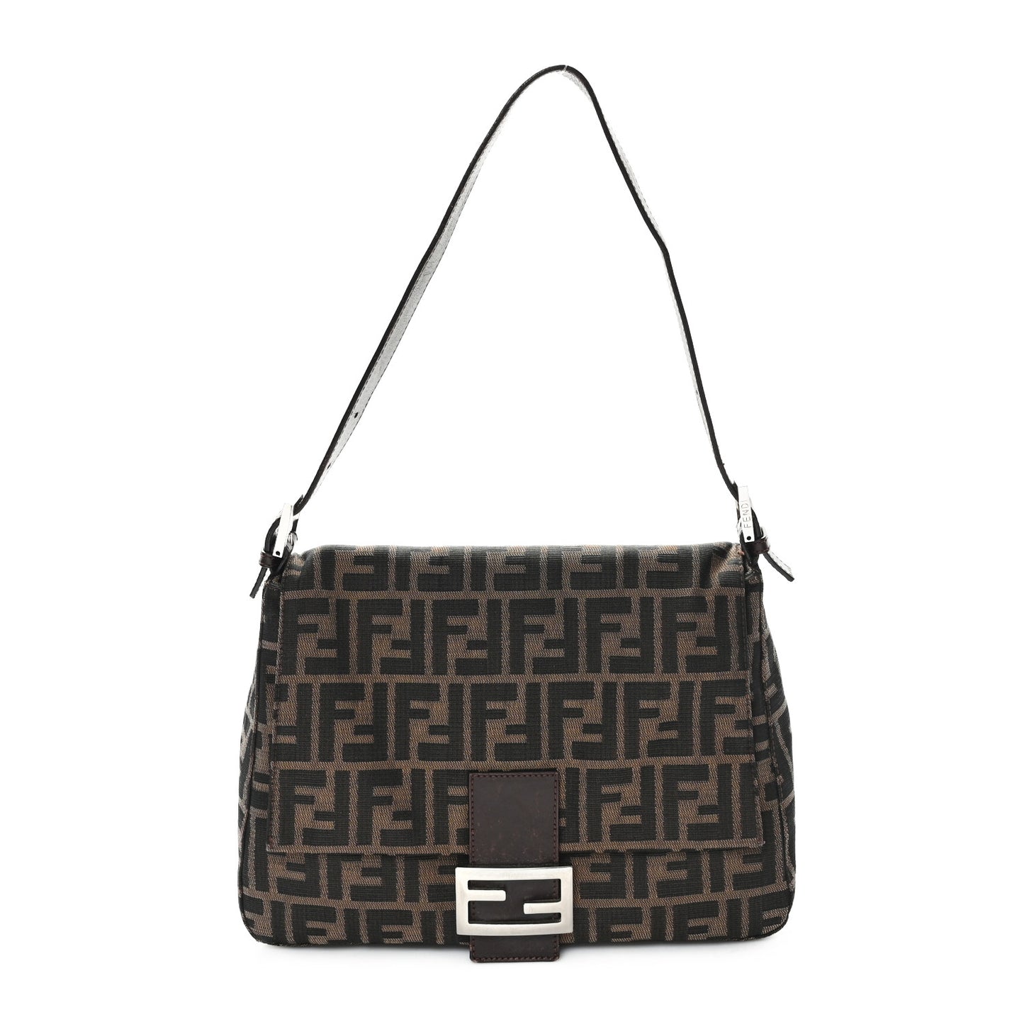 This is an authentic FENDI Zucca Mama Baguette in Tobacco. This classic Baguette is crafted of FF Zucca canvas in brown. It features a front flap, an adjustable brown leather shoulder strap, and a prominent polished silver Fendi FF closure snap. This opens to a brown fabric interior with a zipper pocket.Follow this item for alerts. Fendi is a registered trademark of Fendi. FASHIONPHILE is not affiliated with Fendi.