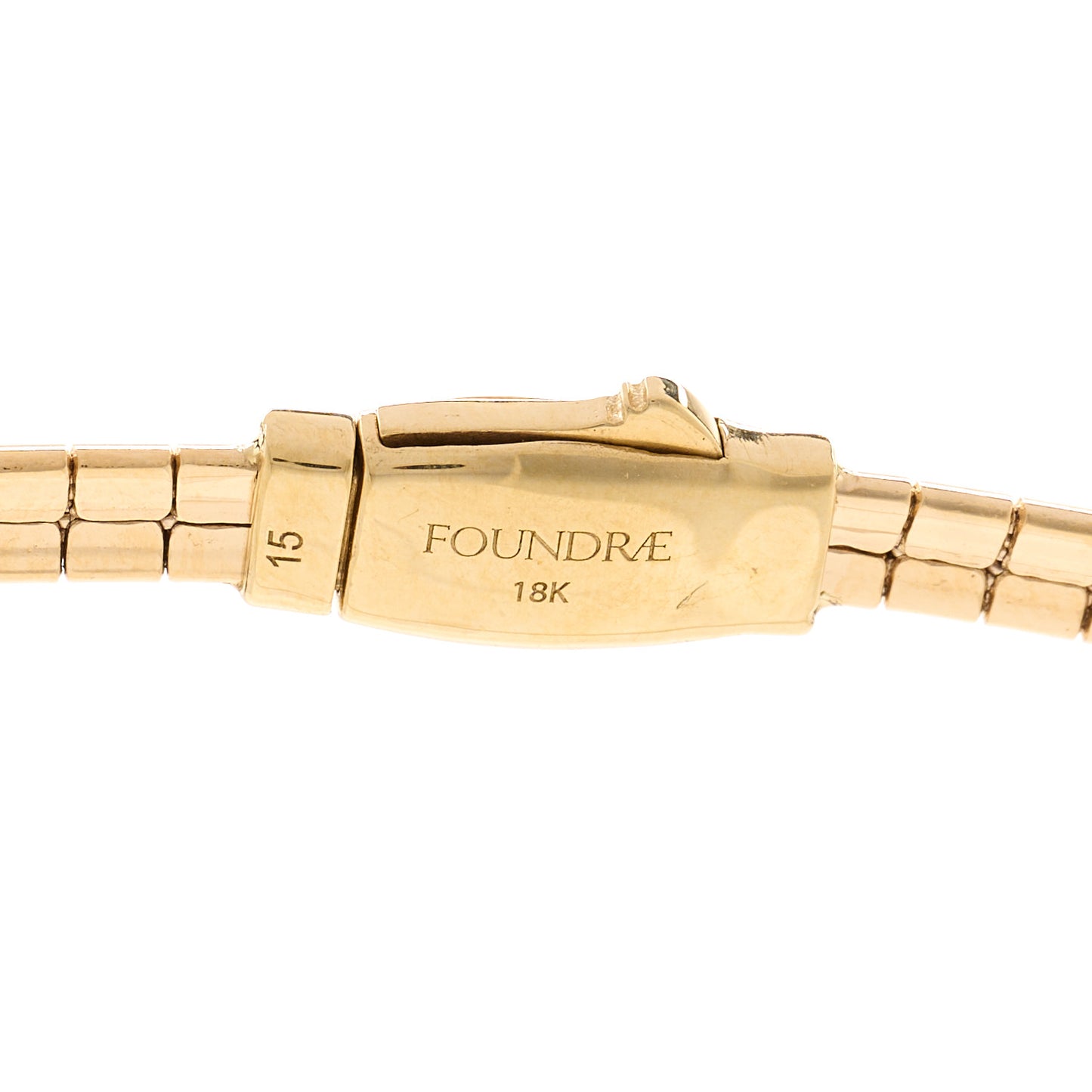 This is an authentic FOUNDRAE 18K 18K Yellow Gold Diamond Large Butterfly Wings Pendant Small Sleek Collar Necklace. The necklace is crafted of 18 karat yellow gold and features a flexible chain with two butterfly wing motifs accented with diamonds, weighing approximately .08 total carat weight.Follow this item for alerts. Foundrae is a registered trademark of Foundrae. FASHIONPHILE is not affiliated with Foundrae.