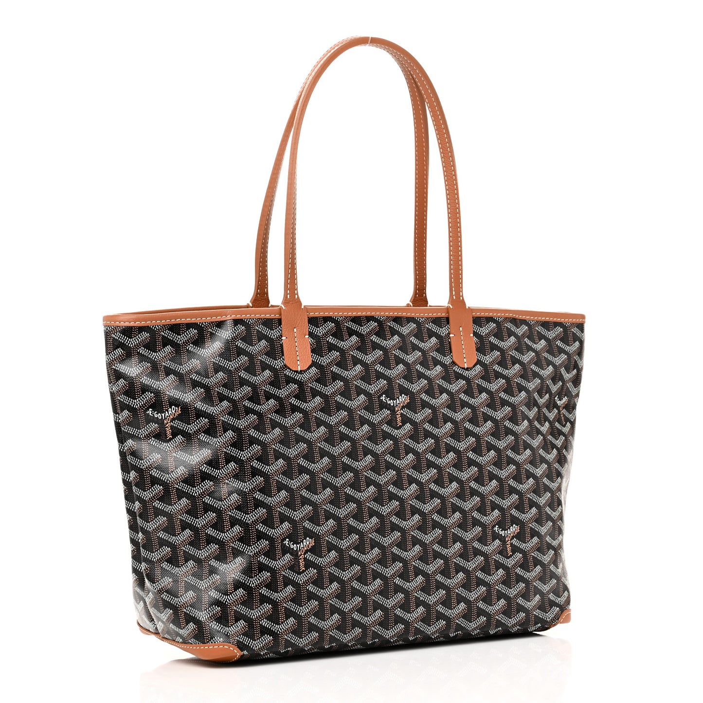 This is an authentic GOYARD Goyardine Artois PM in Black and Gold. This shoulder bag is crafted of Goyardine coated canvas with its iconic chevron pattern. The bag features brown leather trim including strap handles, top edging, and protective corner patches. The silver top zipper opens to a spacious natural canvas interior with a hanging patch pocket.Follow this item for alerts. Goyard is a registered trademark of Goyard. FASHIONPHILE is not affiliated with Goyard.