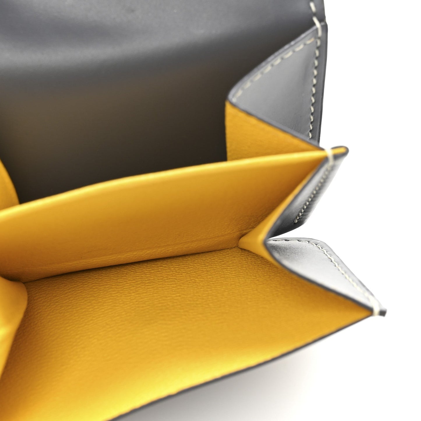 This is an authentic GOYARD Goyardine Coin Pouch in Grey. This stylish compact pouch is crafted of white chevron coated canvas with grey leather. The pouch opens with a flap to a yellow leather interior for currency and small accessories.Follow this item for alerts. Goyard is a registered trademark of Goyard. FASHIONPHILE is not affiliated with Goyard.