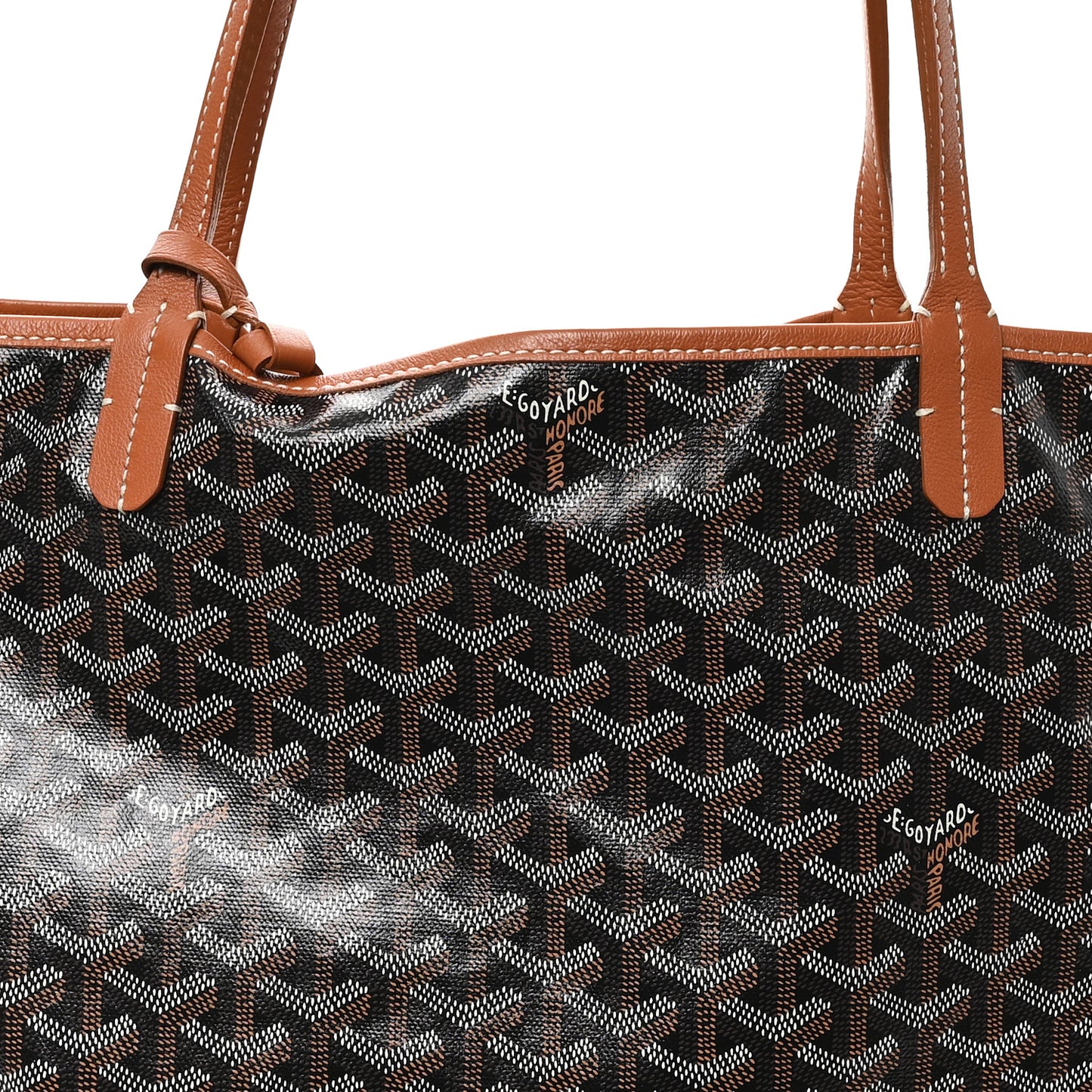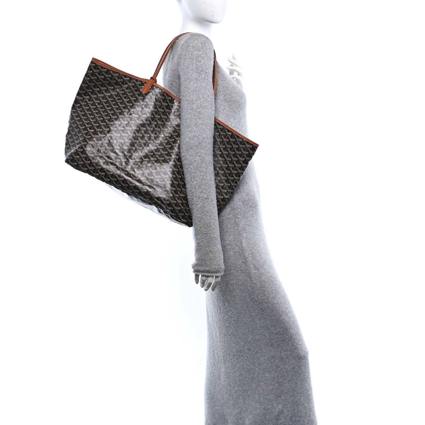 This is an authentic GOYARD Goyardine Saint Louis GM in Black and Gold. This tote is crafted of coated canvas with the classic Goyard chevron monogram in black. The bag features brown leather straps handles and top border trim. The shoulder bag top opens to a natural fabric interior with a matching removable pouch.Follow this item for alerts. Goyard is a registered trademark of Goyard. FASHIONPHILE is not affiliated with Goyard.