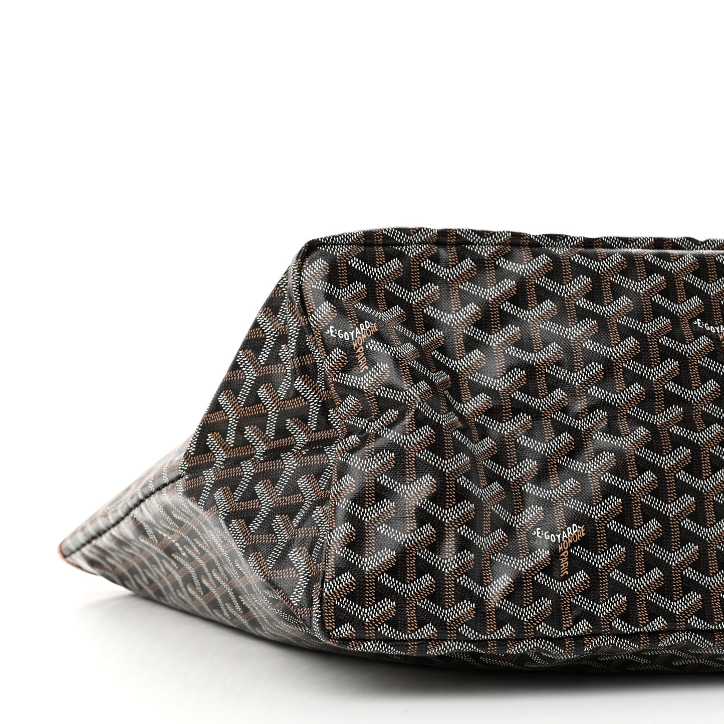 This is an authentic GOYARD Goyardine Saint Louis GM in Black and Gold. This stylish tote features the traditional Goyard chevron in black, white, and brown. The shoulder bag has thin brown leather trim along the top, leather shoulder straps. The top opens to a natural fabric interior and a matching removable pouch.Follow this item for alerts. Goyard is a registered trademark of Goyard. FASHIONPHILE is not affiliated with Goyard.