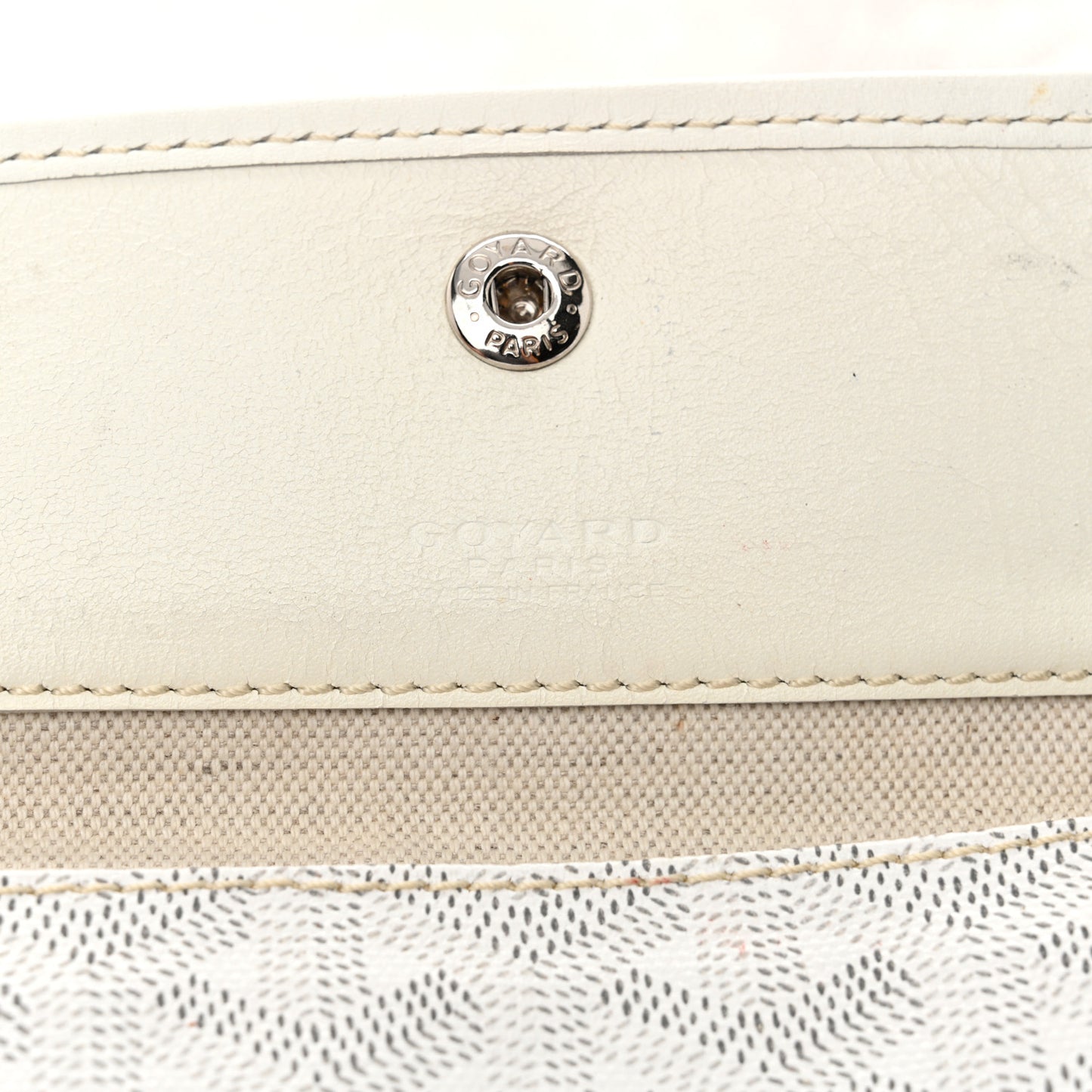 This is an authentic GOYARD Goyardine Saint Louis PM in White. This tote is crafted of Goyard chevron white canvas. The bag has a white leather trim along the top and white leather handles. The top is open to a beige canvas interior with a matching removable pouch.Follow this item for alerts. Goyard is a registered trademark of Goyard. FASHIONPHILE is not affiliated with Goyard.