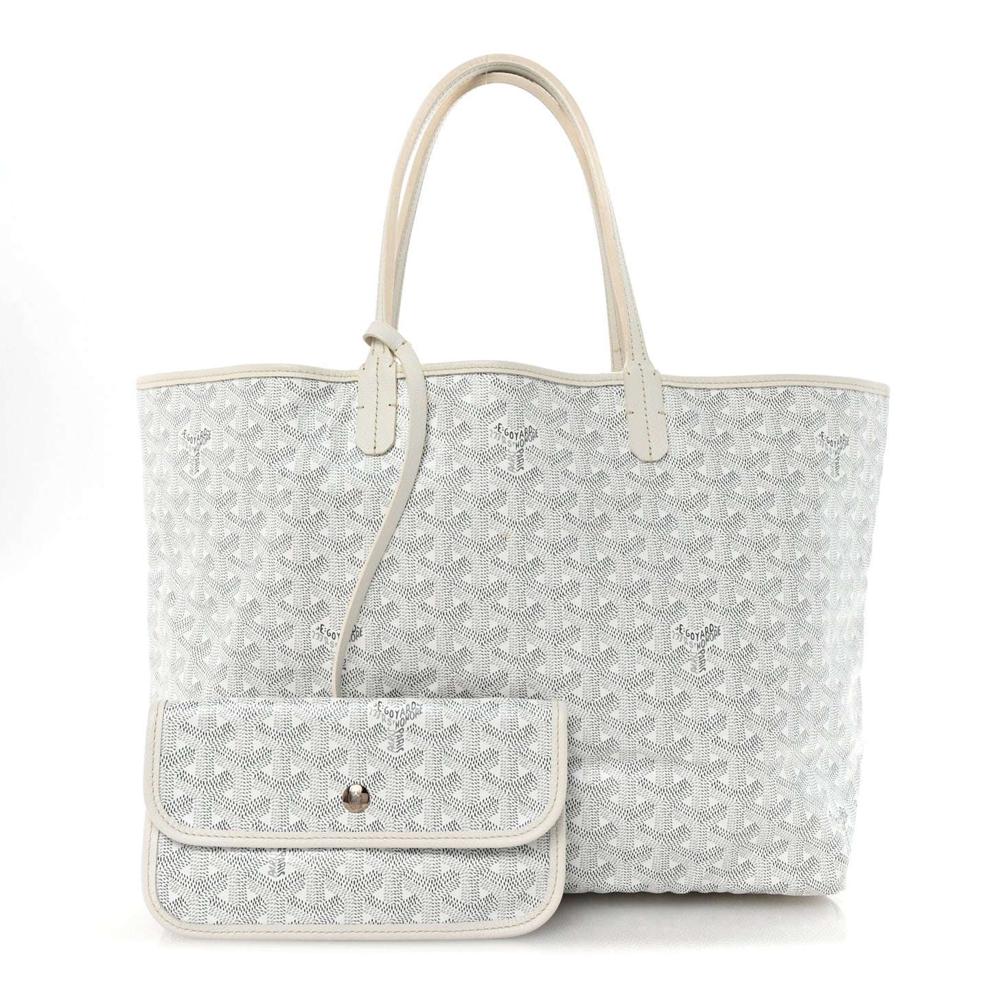 This is an authentic GOYARD Goyardine Saint Louis PM in White. This tote is crafted of Goyard chevron white canvas. The bag has a white leather trim along the top and white leather handles. The top is open to a beige canvas interior with a matching removable pouch.Follow this item for alerts. Goyard is a registered trademark of Goyard. FASHIONPHILE is not affiliated with Goyard.