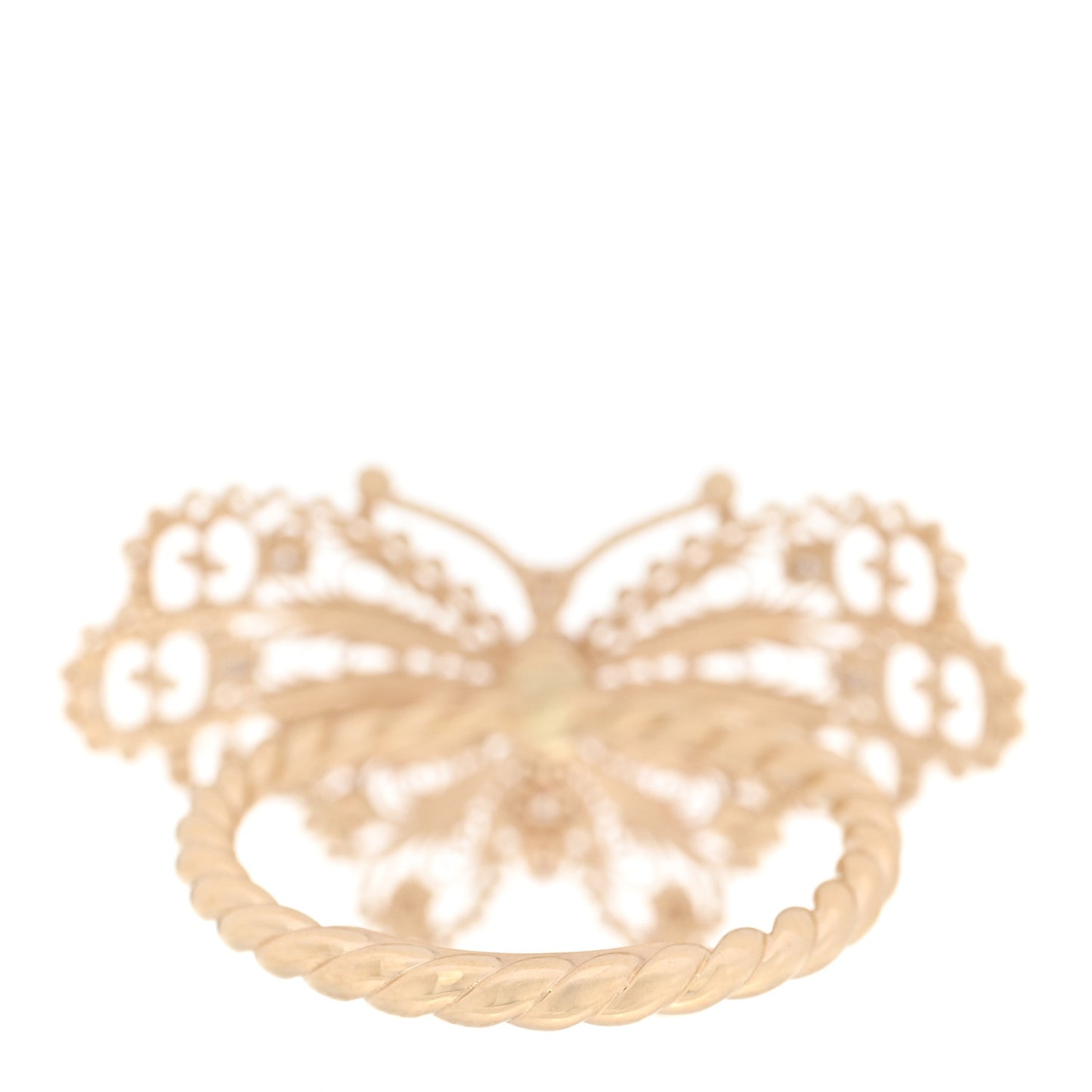 This is an authentic GUCCI 18K Yellow Gold Diamond Butterfly Ring size 53 or 6.25. The ring is crafted of 18 karat yellow gold and features a filigree butterfly motif set with round brilliant cut diamonds, approximately .23 total carat weight.Follow this item for alerts. Gucci is a registered trademark of Gucci. FASHIONPHILE is not affiliated with Gucci.