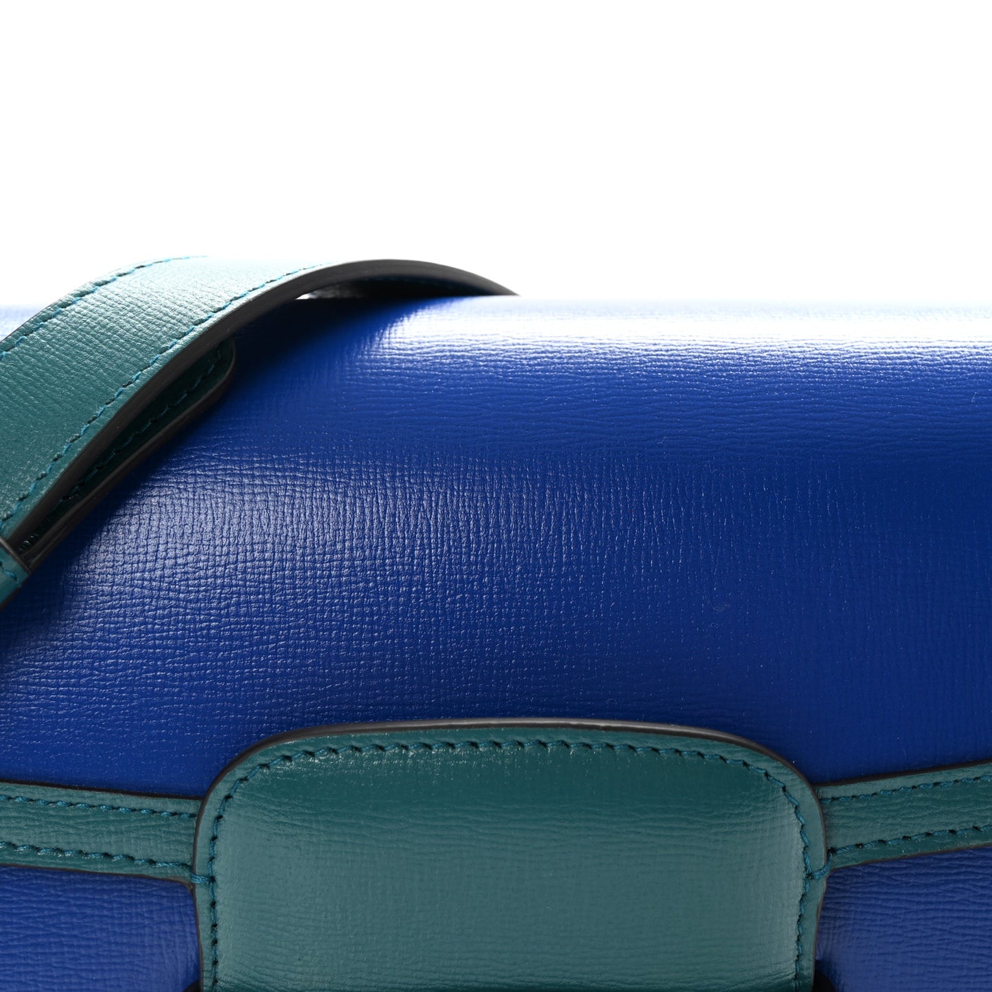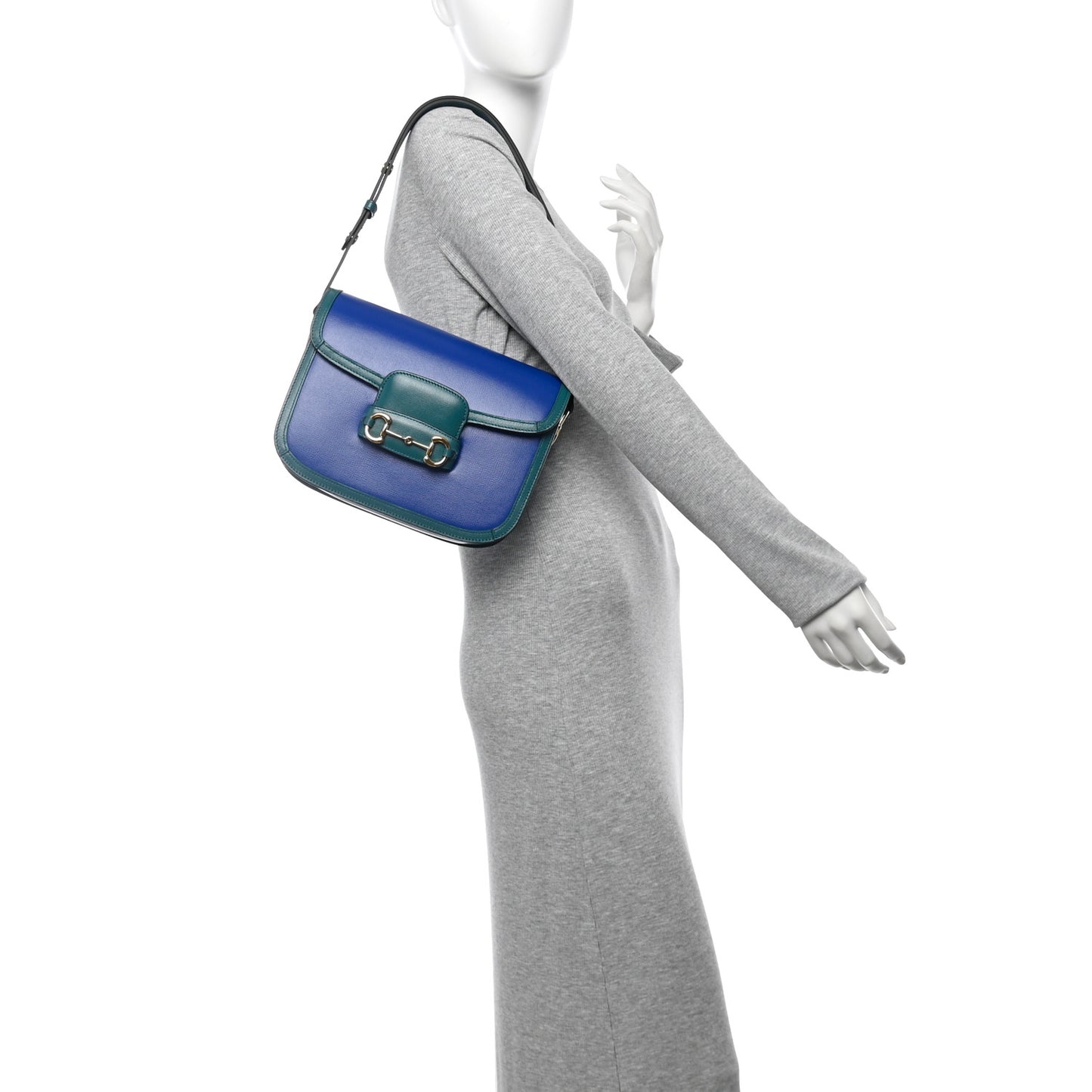 This is an authentic GUCCI Azalea Calfskin Horsebit 1955 Shoulder Bag in Blue and Green. This stylish shoulder bag is crafted of blue calfskin leather. with green leather trim. The bag features a looping leather shoulder strap and gold horsebit detail. The top flap opens to a compartmentalized beige fabric interior with zipper and patch pockets.Follow this item for alerts. Gucci is a registered trademark of Gucci. FASHIONPHILE is not affiliated with Gucci.