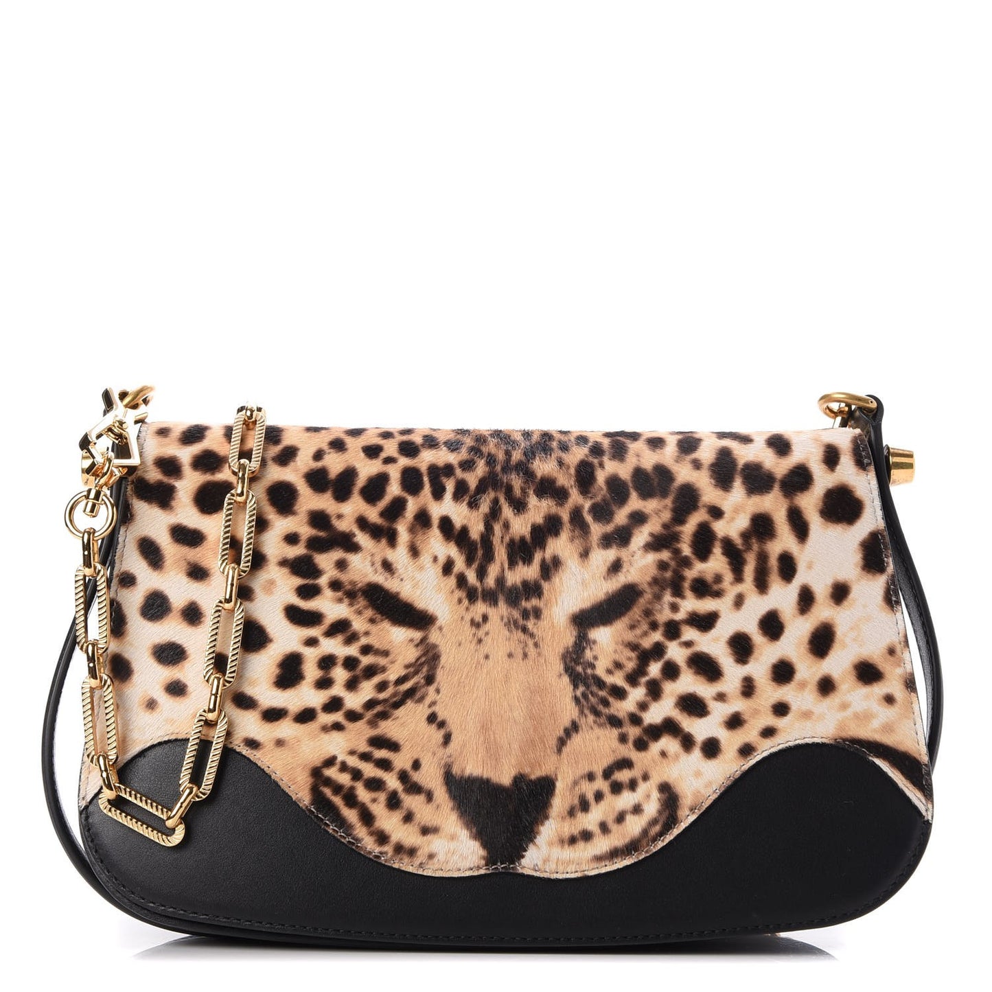 This is an authentic GUCCI Calf Hair Leopard Print Shoulder Bag in Black. This chic structured shoulder bag is crafted of leopard print calf hair with a leopard face on the flap. This stylish bag has a classic black leather strap, and a decorative gold link shoulder strap.The flap opens to a partitioned suede interior with a zippered pocket. This shoulder bag is an ideal statement bag, with the sophisticated style only from Gucci!Follow this item for alerts. Gucci is a registered trademark of Gucci. FASHIONPHILE is not affiliated with Gucci.