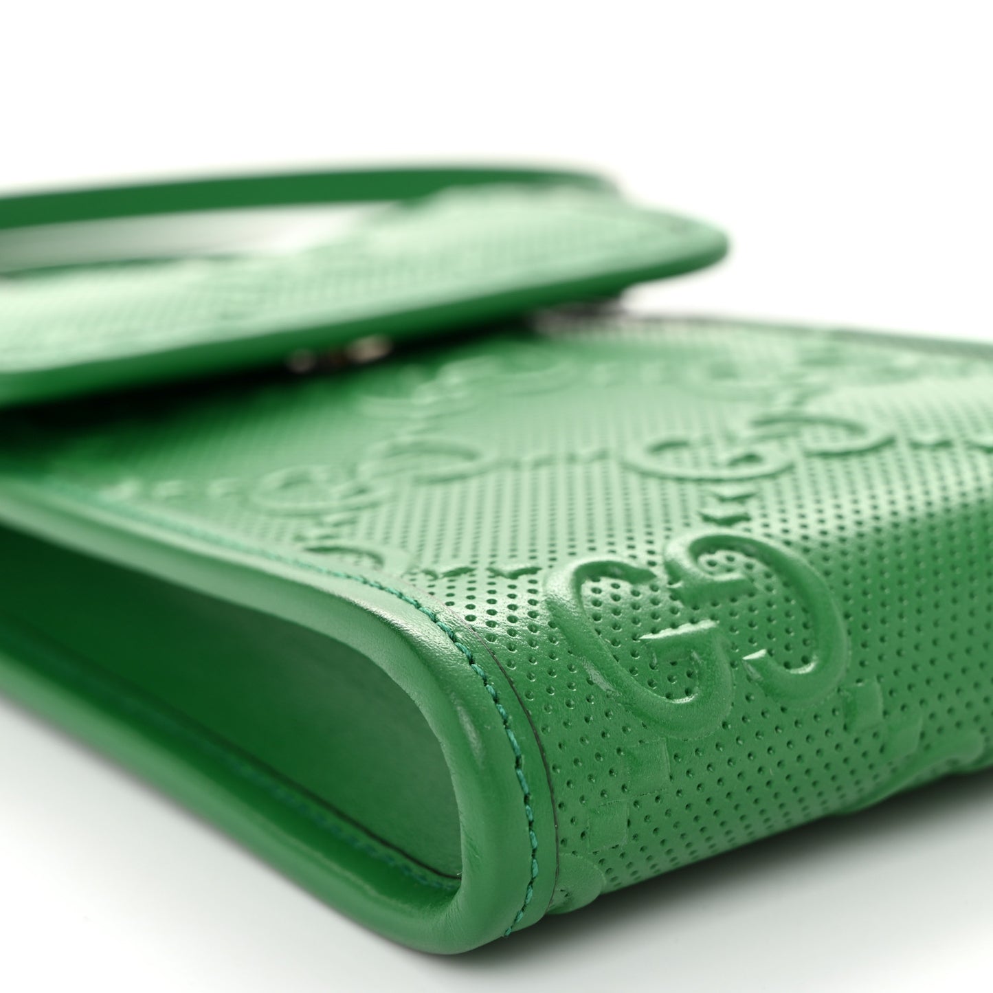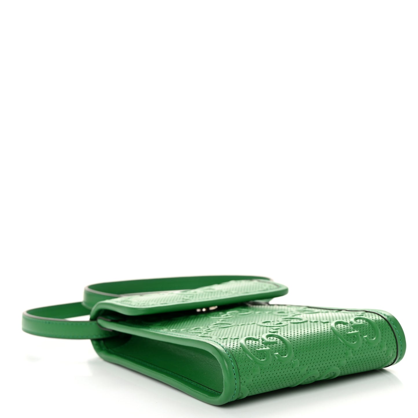 This is an authentic GUCCI Calfskin GG Tennis Embossed Mini Crossbody Bag in New Shamarock. This stylish crossbody is crafted of perforated embossed leather in green. The bag features a long leather shoulder strap and silver hardware. The front flap opens to a natural fabric interior with leather card slots.Follow this item for alerts. Gucci is a registered trademark of Gucci. FASHIONPHILE is not affiliated with Gucci.