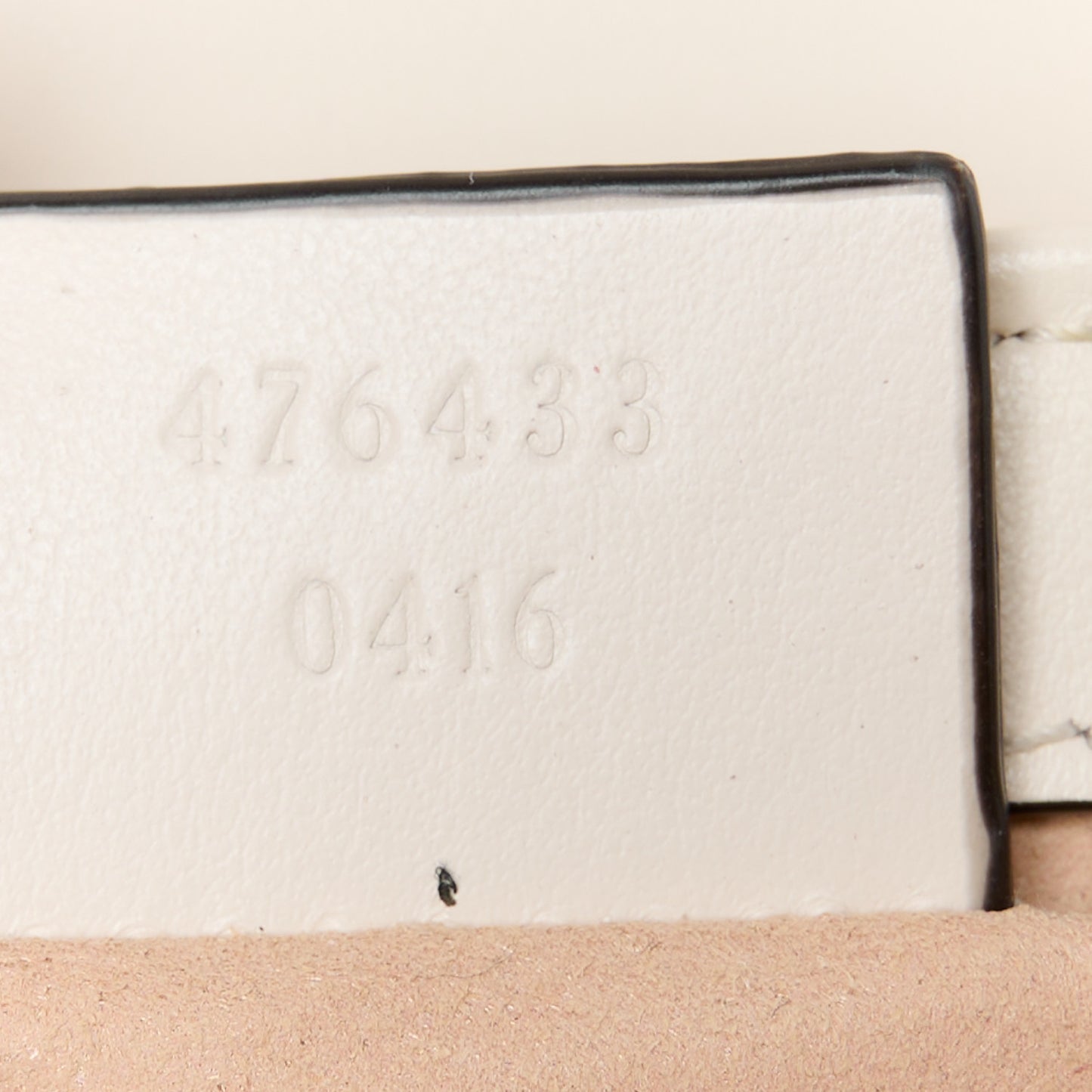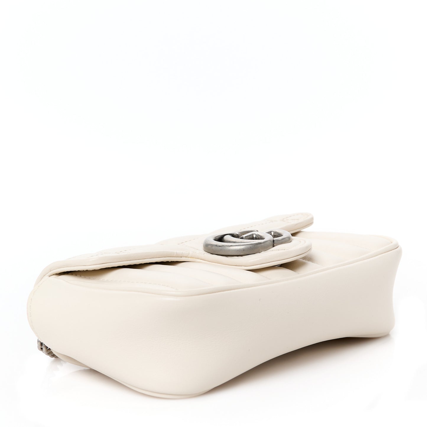 This is an authentic GUCCI Calfskin Matelasse Aria Super Mini GG Marmont Shoulder Bag in Mystic White. This shoulder bag is crafted of white calfskin leather. This crossbody bag features an aged silver chain shoulder strap. The front crossover flap features an aged silver GG logo that opens to a light beige interior with a key ring.Follow this item for alerts. Gucci is a registered trademark of Gucci. FASHIONPHILE is not affiliated with Gucci.