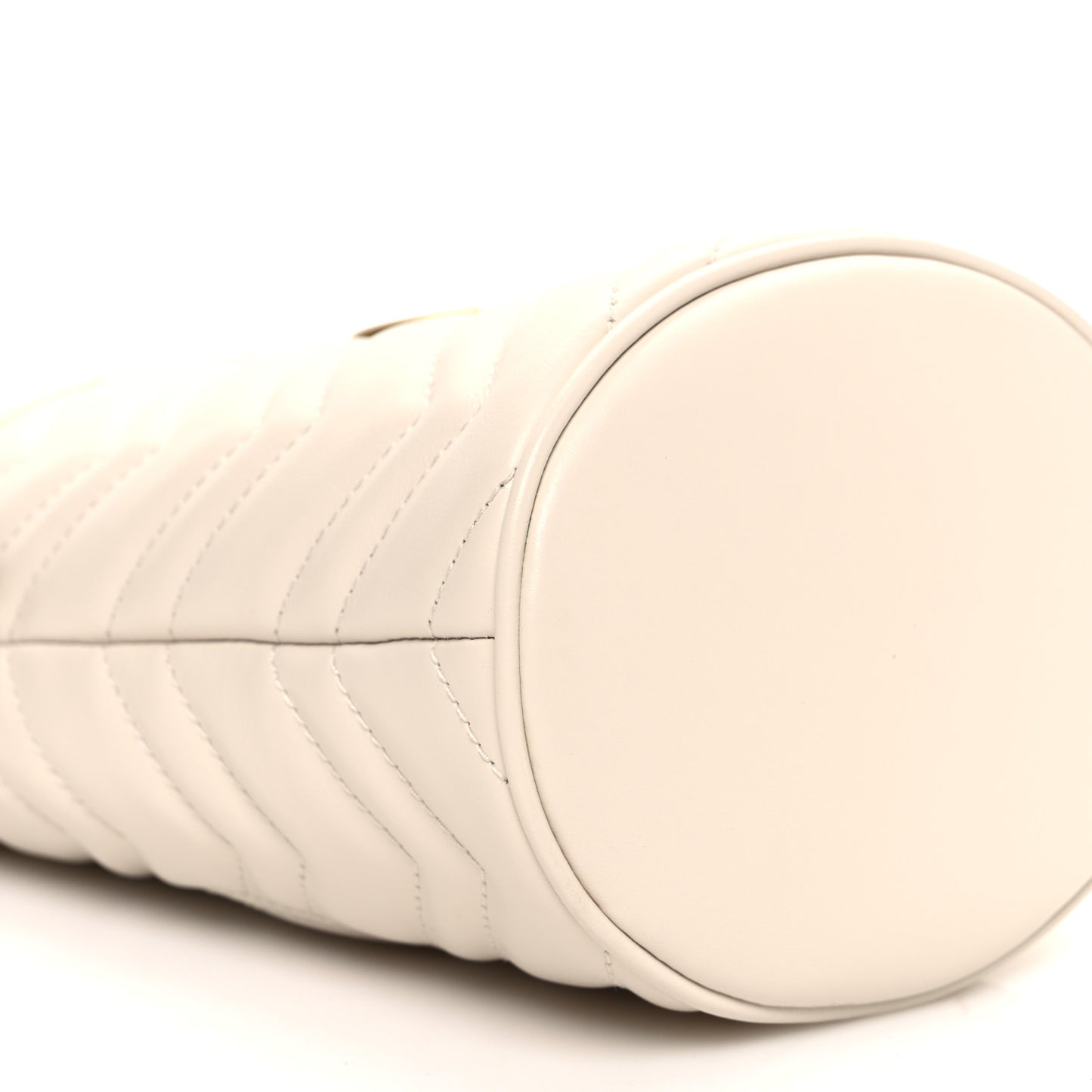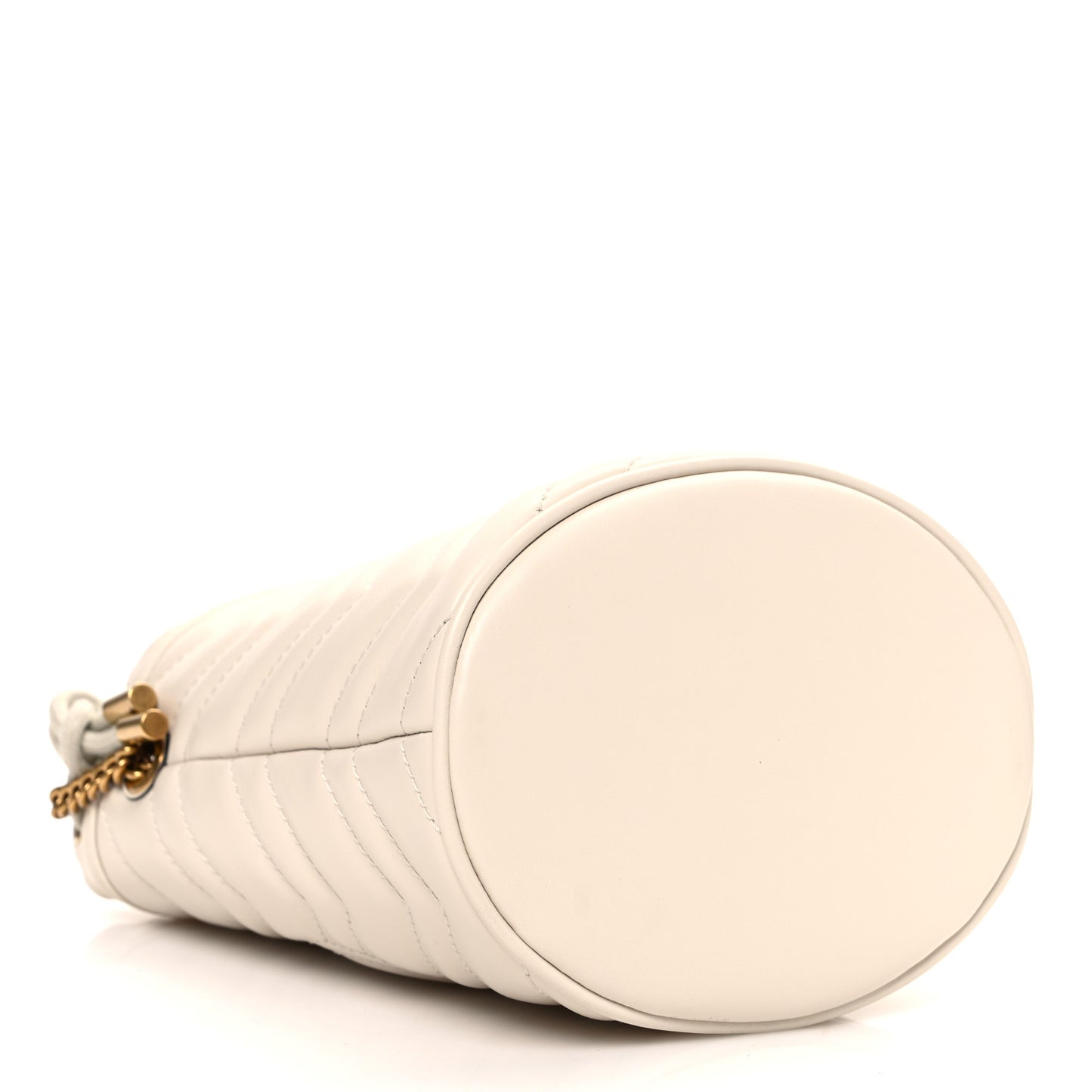 This is an authentic GUCCI Calfskin Matelasse Mini GG Marmont 2.0 Bucket Bag in White. This soft-structured bucket bag is crafted of soft calfskin leather in white with a beautifully stitched chevron pattern. It features an aged chain shoulder strap, a top cinch cord, and an aged gold Gucci GG logo. This top cinch chord opens to a beige microfiber interior with card slots and a removable key ring.Follow this item for alerts. Gucci is a registered trademark of Gucci. FASHIONPHILE is not affiliated with Gucci.