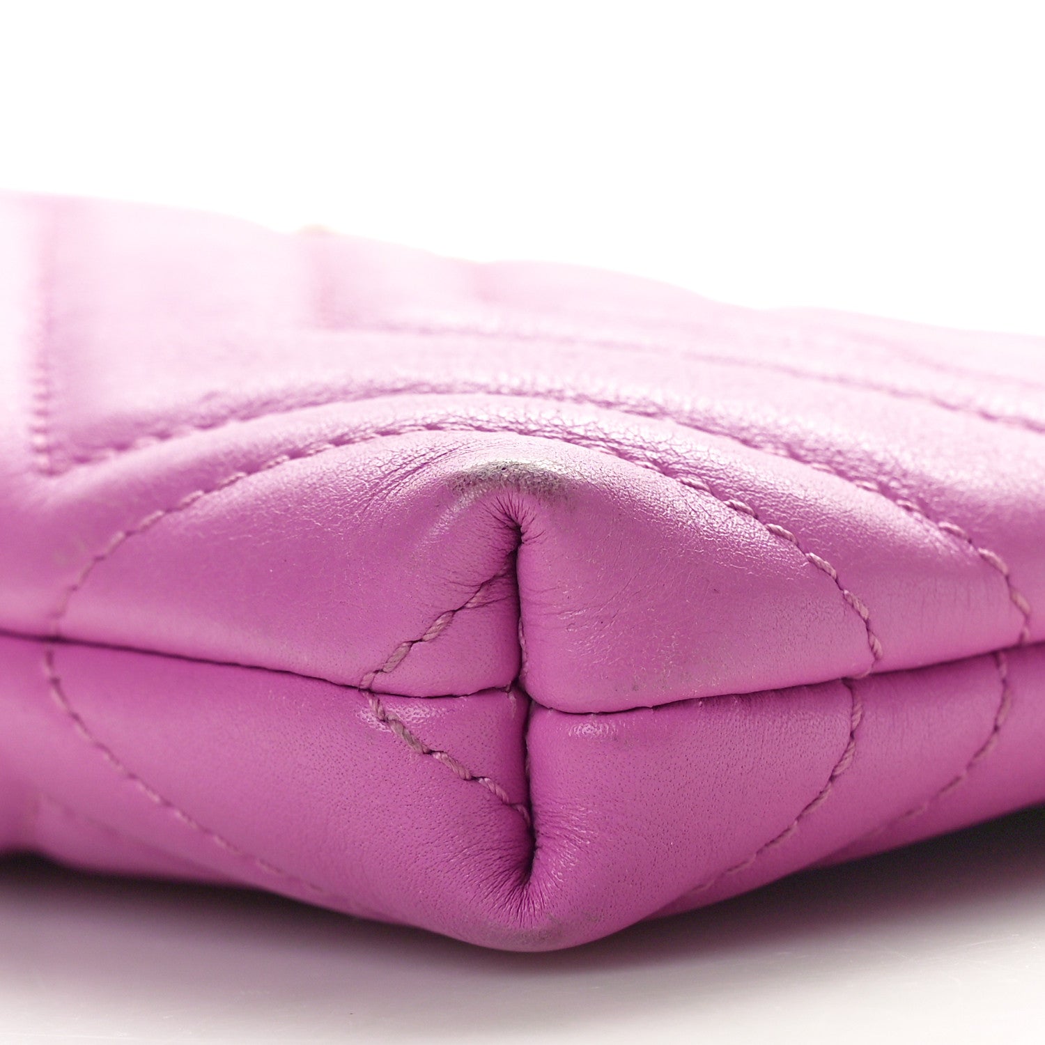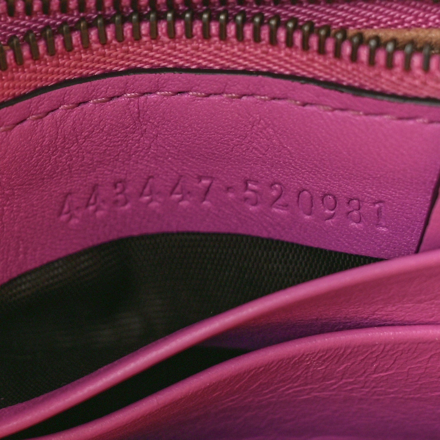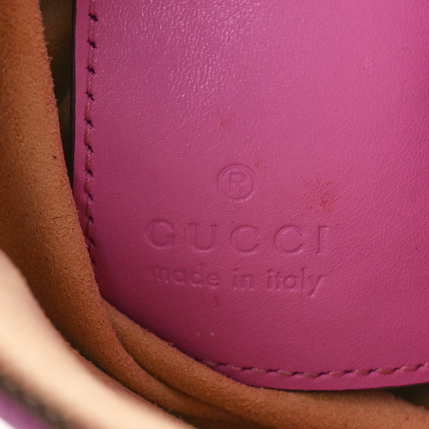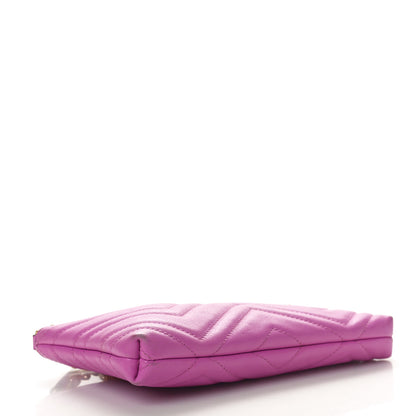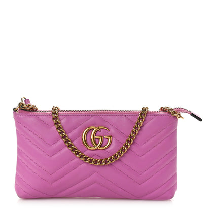 This is an authentic GUCCI Calfskin Matelasse Mini GG Marmont Chain Bag in Candy Mousse. This shoulder bag is crafted of chevron quilted calfskin leather in magenta. The bag features a matching leather shoulder strap with aged gold links and an aged gold GG logo on the front. The bag opens to a beige microfiber interior with a pocket.Follow this item for alerts. Gucci is a registered trademark of Gucci. FASHIONPHILE is not affiliated with Gucci.