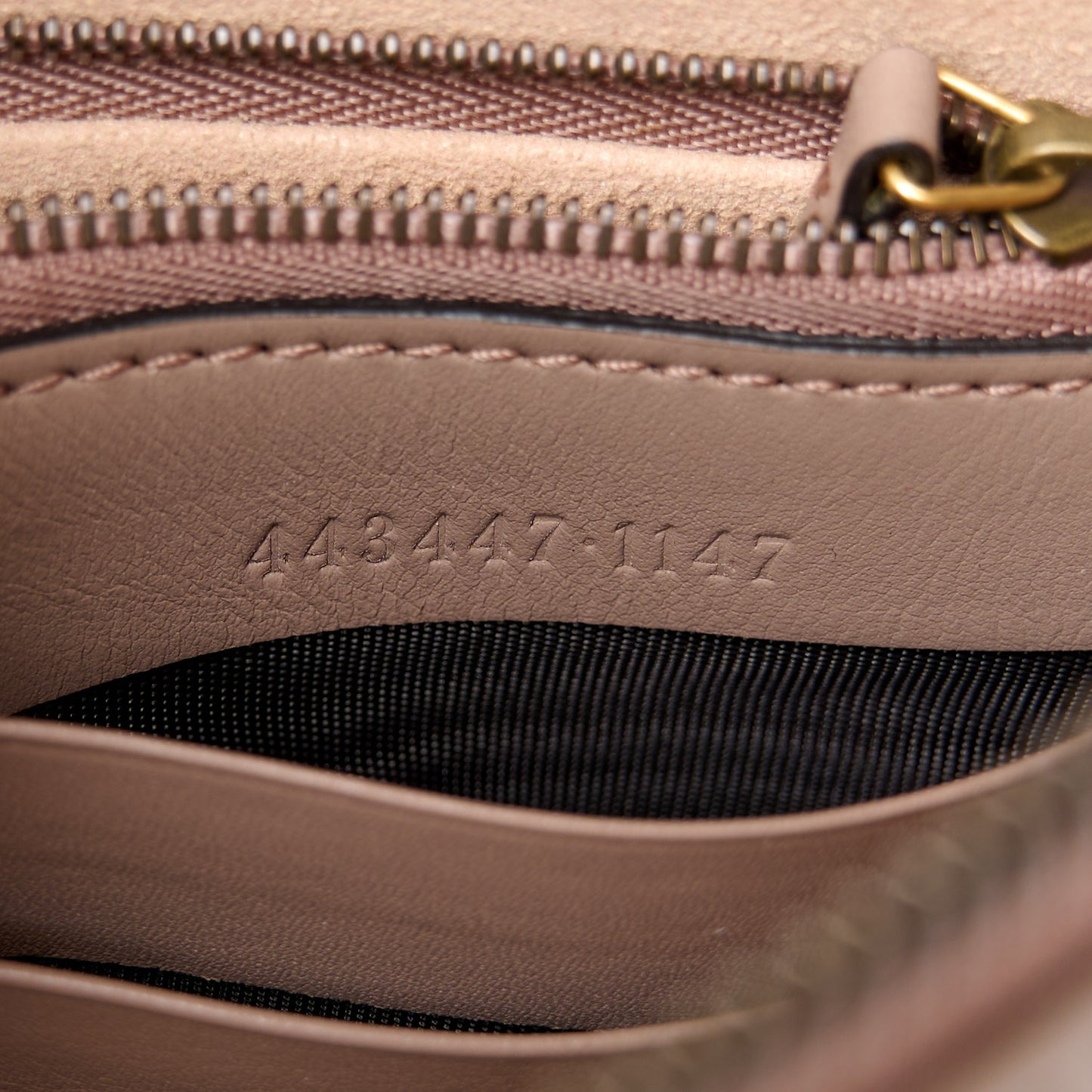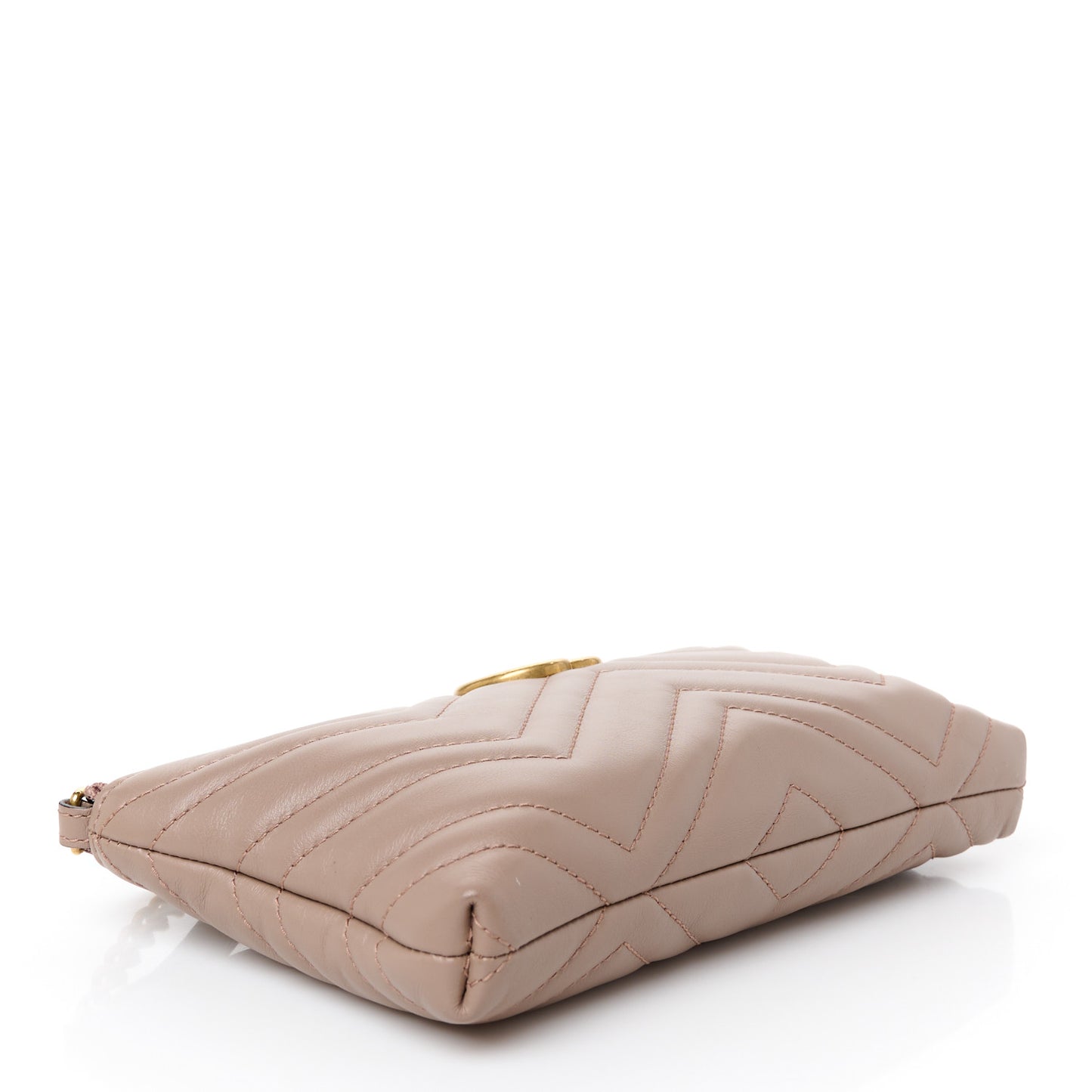 This is an authentic GUCCI Calfskin Matelasse Mini GG Marmont Chain Shoulder Bag Porcelain Rose. This stylish bag is crafted of chevron quilted calfskin leather in taupe. The bag features an antiqued gold chain shoulder strap and a matching gold GG logo on the front. The top zipper opens the bag to a beige microfiber interior with a zipper pocket and leather card slots.Follow this item for alerts. Gucci is a registered trademark of Gucci. FASHIONPHILE is not affiliated with Gucci.