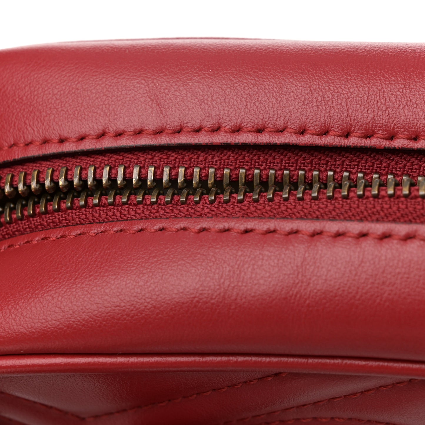 This is an authentic GUCCI Calfskin Matelasse Mini GG Marmont Chain Shoulder Bag in Hibiscus Red. This shoulder bag is crafted of smooth and supple calfskin leather in red with chevron detailing. This bag features an aged gold chain and leather shoulder strap and a Gucci GG logo on the front. The top zipper opens to a beige microfiber interior with a flat pocket.Follow this item for alerts. Gucci is a registered trademark of Gucci. FASHIONPHILE is not affiliated with Gucci.
