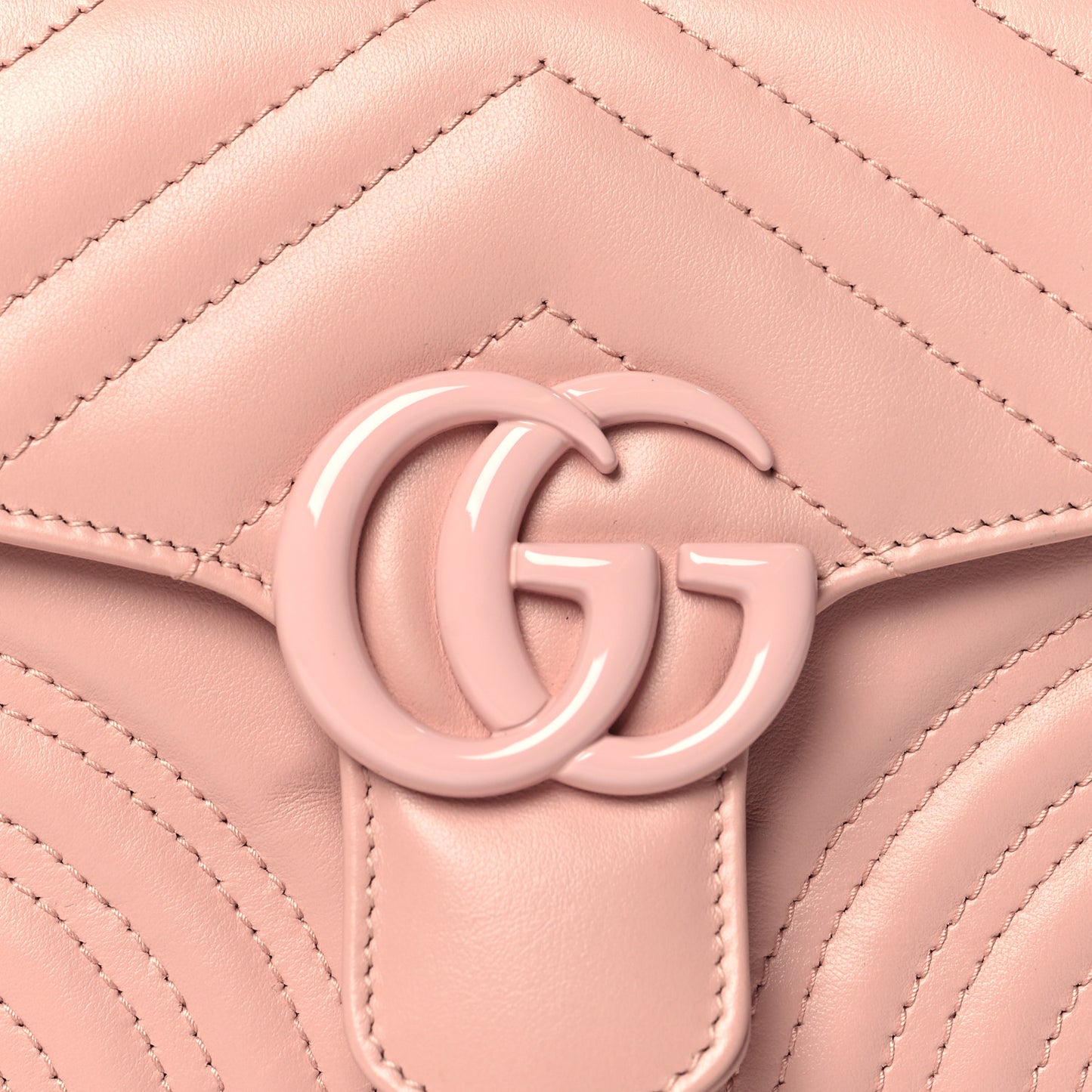 This is an authentic GUCCI Calfskin Matelasse Monochrome Mini GG Marmont Top Handle Shoulder Bag in Perfect Pink. This shoulder bag is crafted of smooth and supple calfskin leather in pink. This bag features a leather top handle and an optional pink chain-link shoulder strap with a leather shoulder pad. The front crossover flap has an interlocking GG logo and opens to a compact pink fabric interior with a patch pocket.Follow this item for alerts. Gucci is a registered trademark of Gucci. FASHIONPHILE is not affiliated with Gucci.
