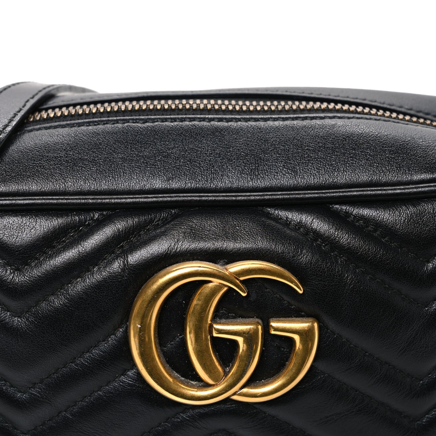 This is an authentic GUCCI Calfskin Matelasse Small GG Marmont Chain Shoulder Bag in Black. This shoulder bag is crafted of smooth and supple calfskin leather in black. This bag features an aged gold chain with a leather shoulder pad and a Gucci GG logo on the front. The top zipper opens to a beige microfiber interior with a flat pocket.Follow this item for alerts. Gucci is a registered trademark of Gucci. FASHIONPHILE is not affiliated with Gucci.