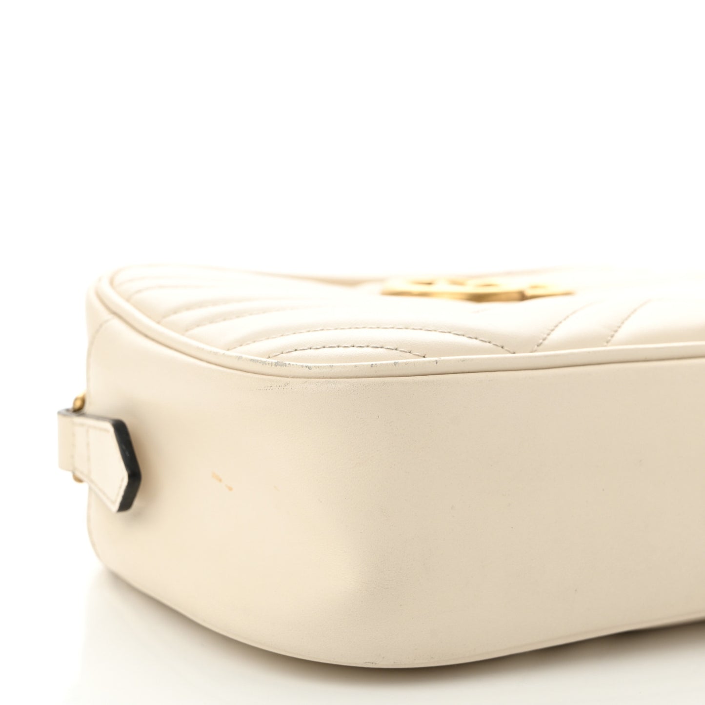This is an authentic GUCCI Calfskin Matelasse Small GG Marmont Chain Shoulder Bag in White. This shoulder bag is crafted of smooth and supple white calfskin leather. This crossbody bag features an antiqued gold chain with a leather shoulder strap and an interlocking antiqued gold GG logo. The top zipper opens to a beige microfiber interior with a patch pocket.Follow this item for alerts. Gucci is a registered trademark of Gucci. FASHIONPHILE is not affiliated with Gucci.
