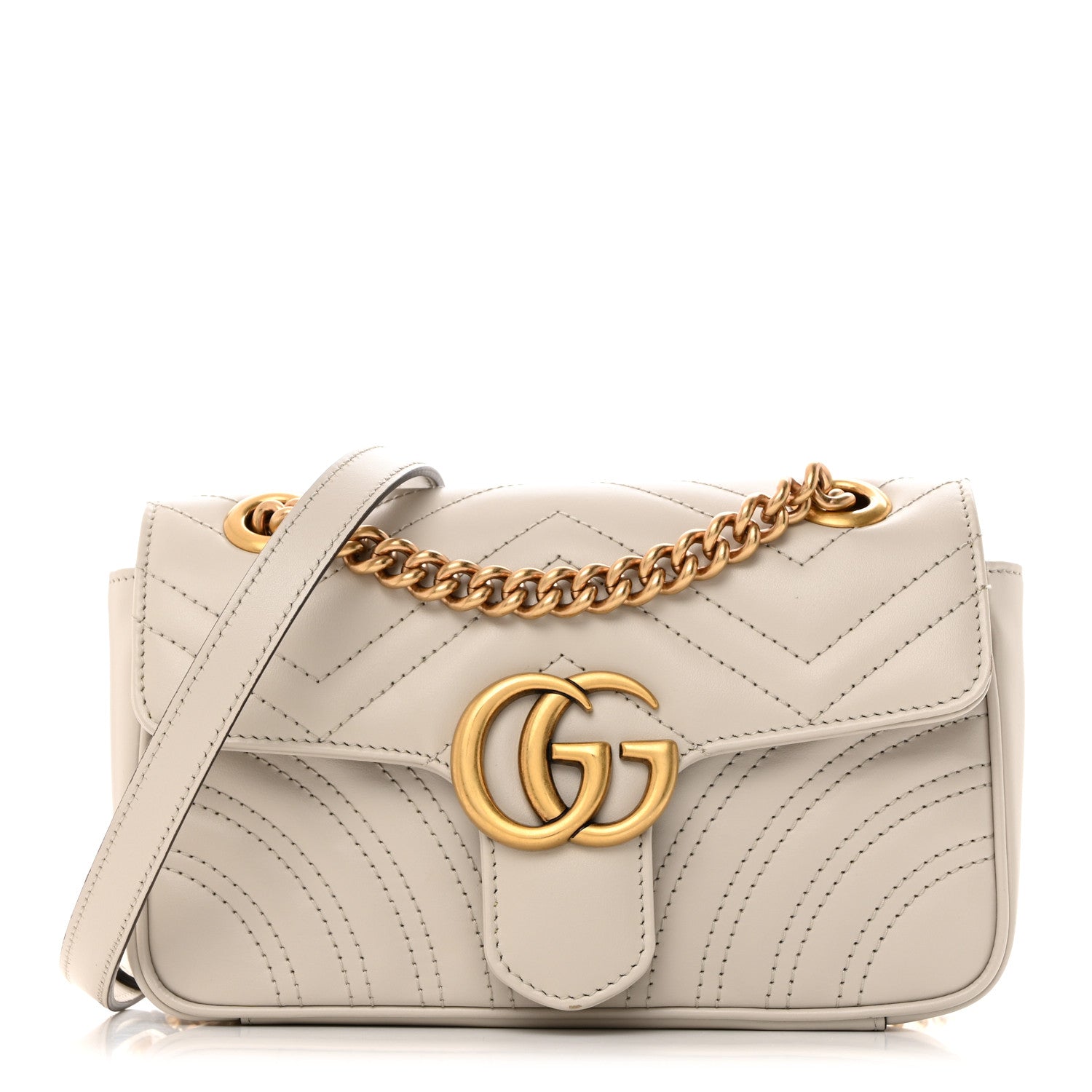 This is an authentic GUCCI Calfskin Matelasse Small GG Marmont Shoulder Bag in Light Grey. This handbag is crafted of chevron-quilted soft calfskin leather in light grey. This bag features an aged gold chain shoulder strap with a leather shoulder pad and a signature GG logo on the front. The flap opens to a beige microfiber interior with a zipper pocket.