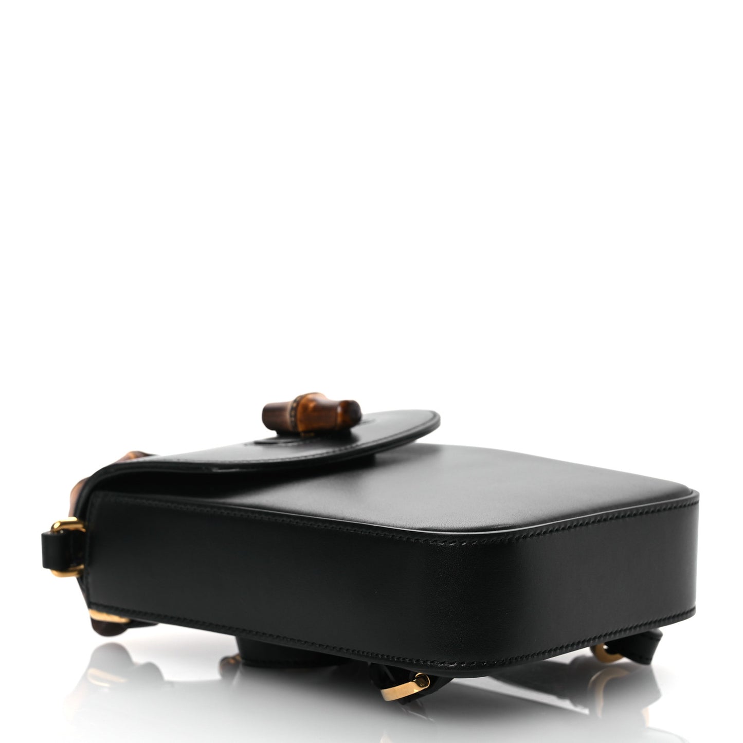 This is an authentic GUCCI Calfskin Mini Bamboo Top Handle 3 Way Shoulder Bag in Black. This chic bag is crafted of calfskin leather in black. The bag has a sturdy looping bamboo top handle and gold hardware. This opens to a beige fabric interior with a black leather patch pocket.Follow this item for alerts. Gucci is a registered trademark of Gucci. FASHIONPHILE is not affiliated with Gucci.