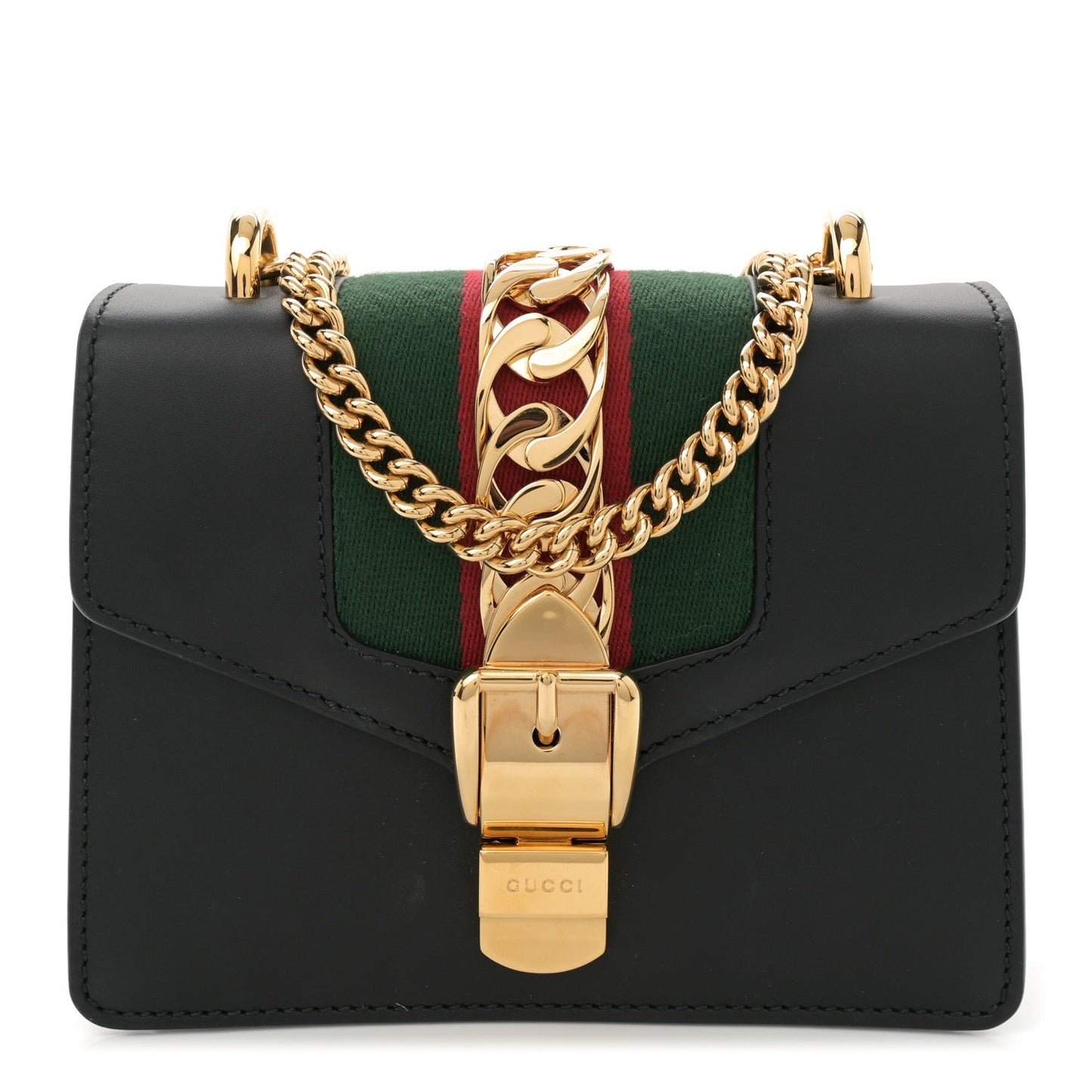 This is an authentic GUCCI Calfskin Mini Sylvie Chain Shoulder Bag in Black. This structured shoulder bag is crafted of smooth black calfskin leather and features a prominent front flap detailed with a central nylon red and green web stripe embellished with a chain buckle lock closure. This stylish bag has a classic gold chain link shoulder strap. The top flap opens to a camel microfiber lining interior with a patch pocket.Follow this item for alerts. Gucci is a registered trademark of Gucci. FASHIONPHILE is not affiliated with Gucci.