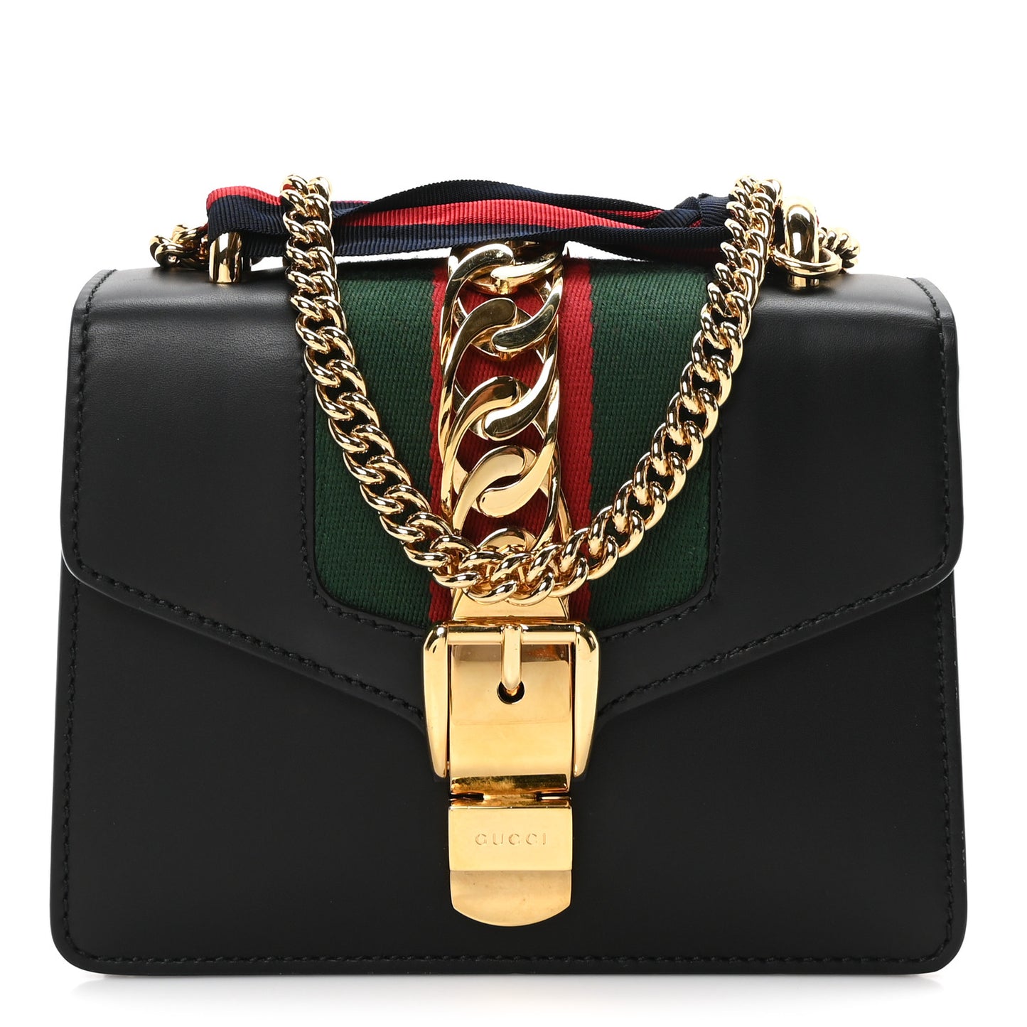 This is an authentic GUCCI Calfskin Mini Sylvie Chain Shoulder Bag in Black. This structured shoulder bag is crafted of smooth black calfskin leather and features a prominent front flap detailed with a central nylon red and green web stripe embellished with a chain buckle lock closure. This stylish bag has a classic gold chain link shoulder strap and a red and blue webbed stripe Sylvie ribbon. The top flap opens to a camel microfiber lining interior with a patch pocket.Follow this item for alerts. Gucci is a registered trademark of Gucci. FASHIONPHILE is not affiliated with Gucci.